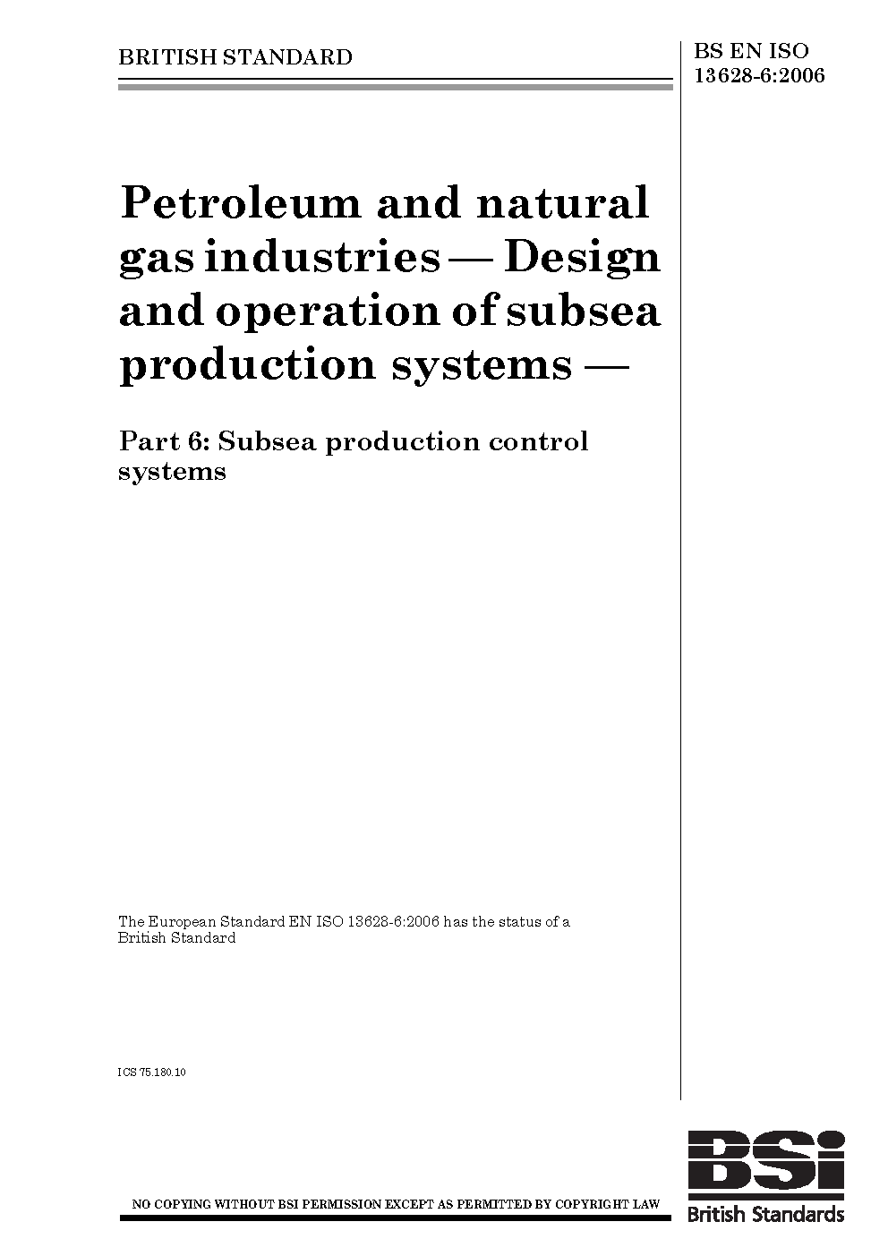 BS EN ISO 13628-6. Petroleum and natural gas industries. Design and operation of subsea production systems. Part 6. Subsea production control