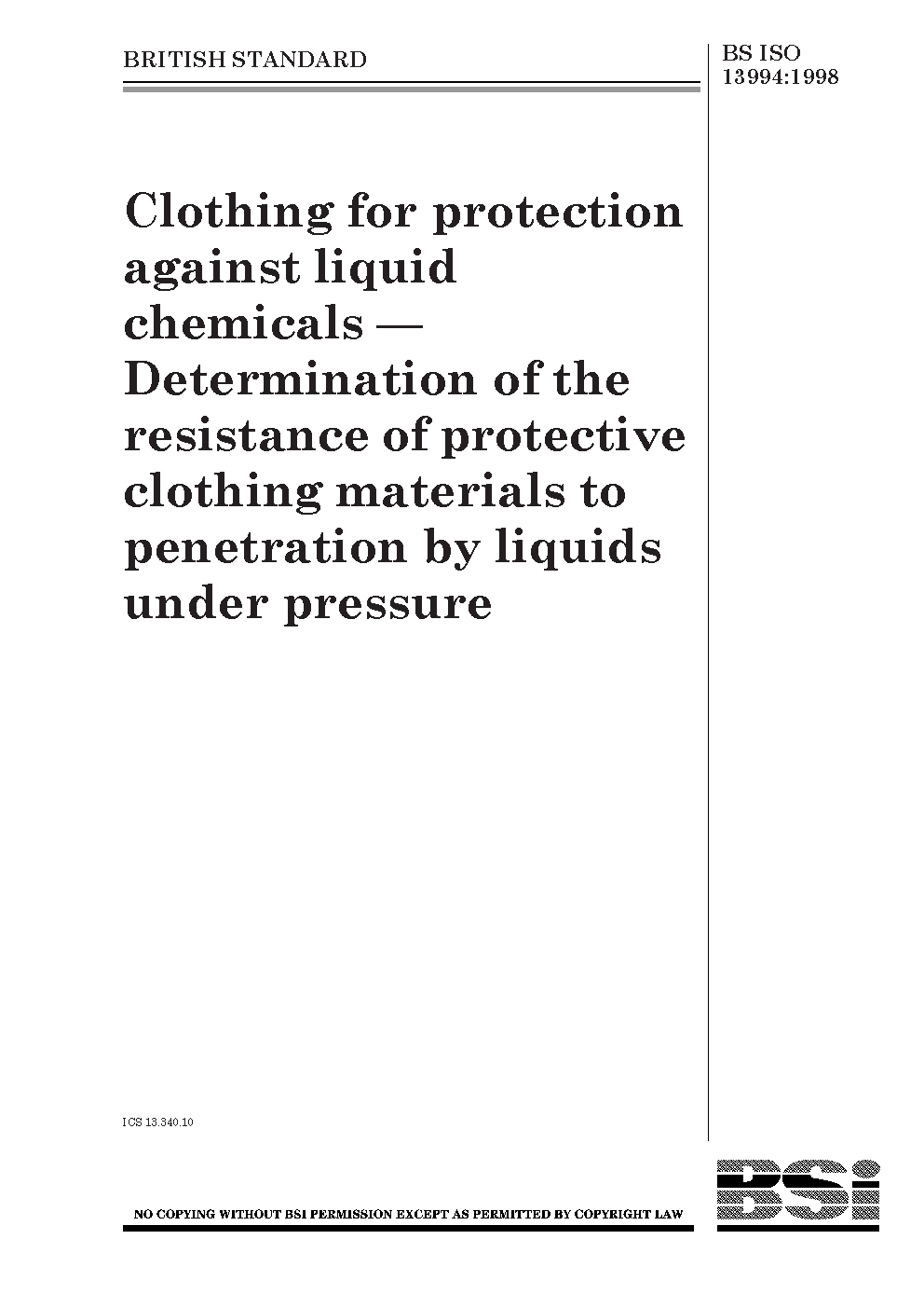 BS ISO 13994. Clothing for protection against liquid chemicals. Determination of the resistance of protective clothing materials to penetration by liquids under pressure