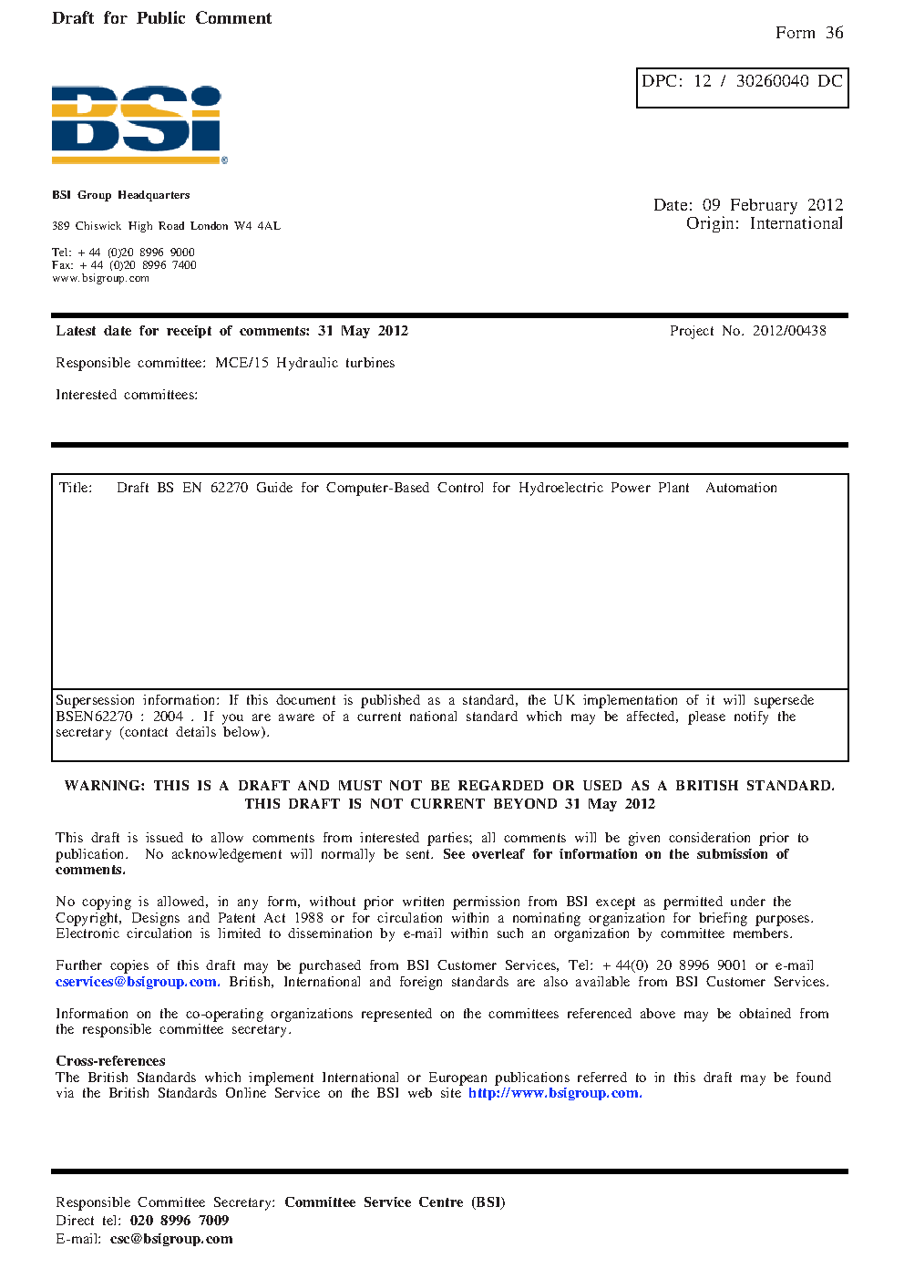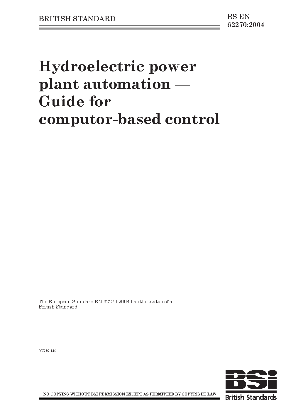 BS EN 62270. Guide for Computer-Based Control for Hydroelectric Power Plant Automation