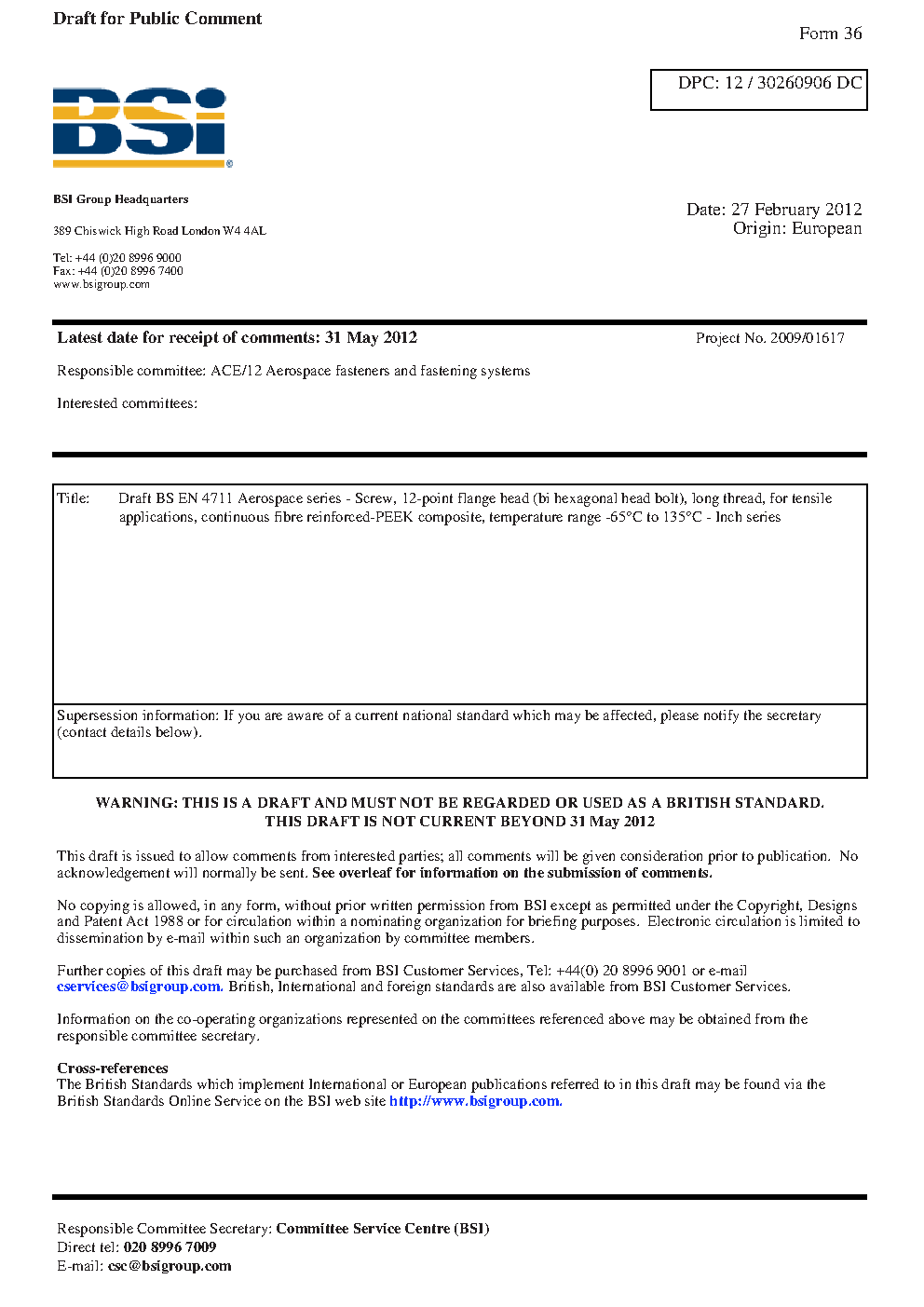 BS EN 4711. Aerospace series. Screw, 12-point flange head (bi hexagonal head bolt), long thread, for tensile applications, continuous fibre reinforced-PEEK composite, temperature range -65°C to 135°C. Inch series