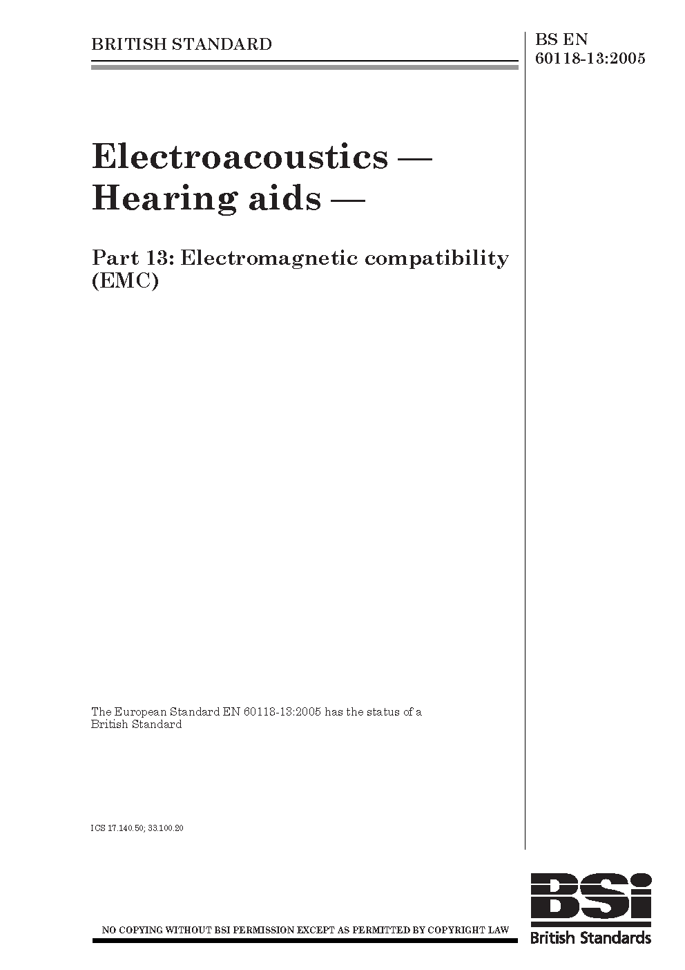 BS EN 60118-13. Electroacoustics. Hearing aids. Part 13. Electromagnetic compatibility (EMC)