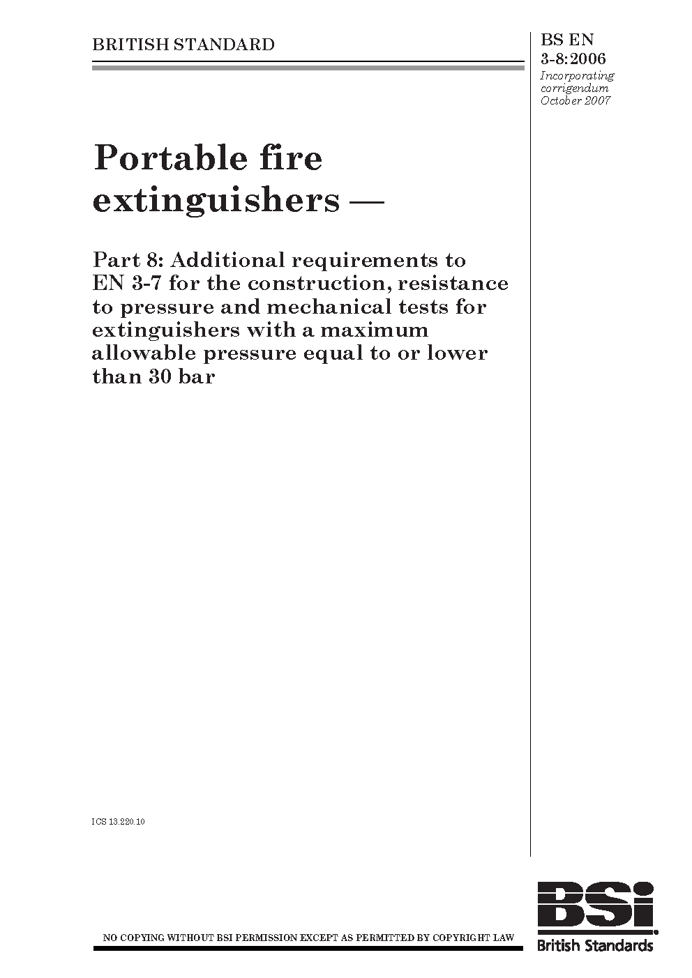 BS EN 3-8. Portable fire extinguishers. Part 8. Requirements for the construction, pressure resistance and mechanical tests for extinguishers with a maximum allowable pressure equal to or lower than 30 bar, which comply with the requirements of EN 3-7