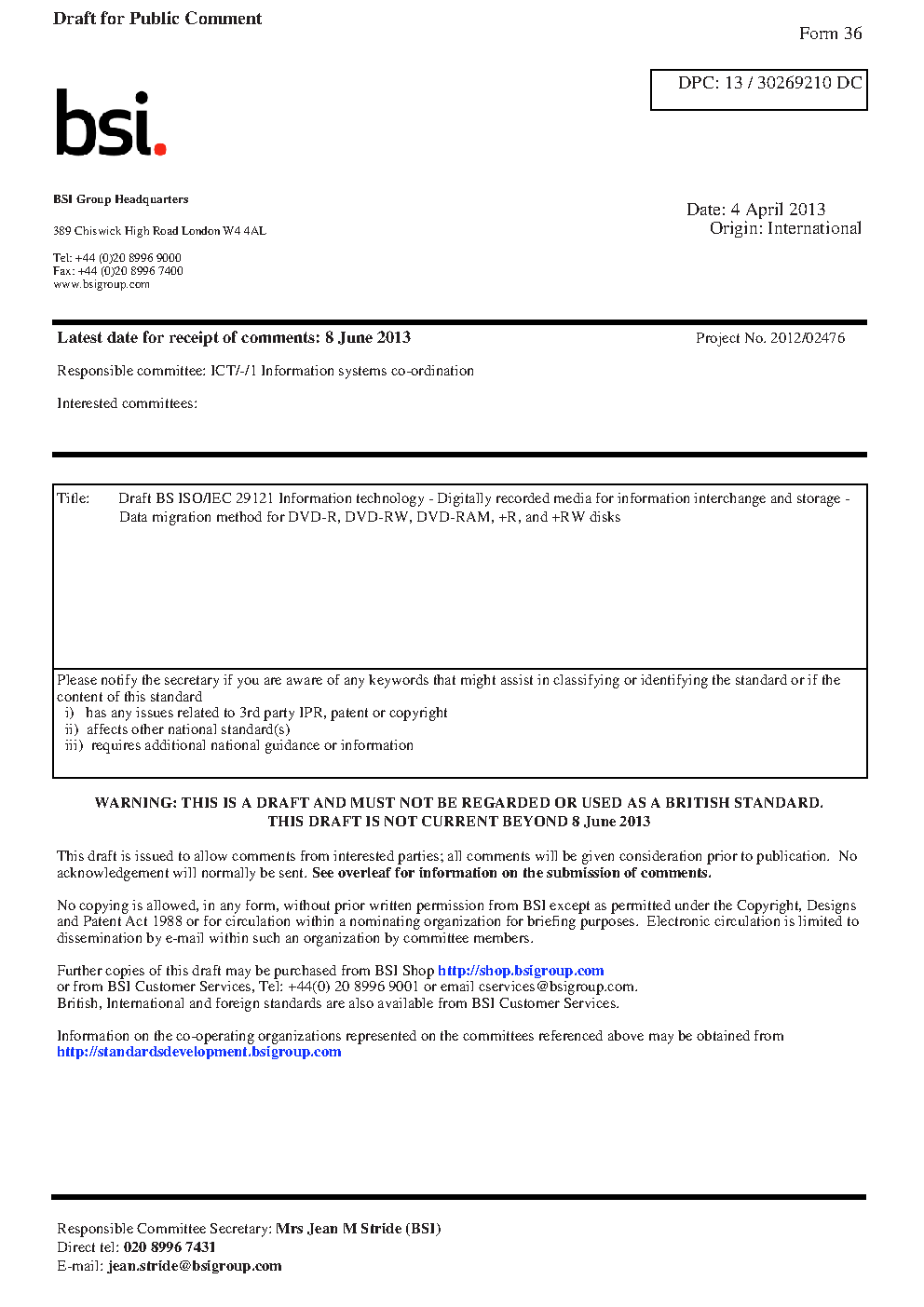 BS ISO/IEC 29121. Information technology. Digitally recorded media for information interchange and storage. Data migration method for DVD-R, DVD-RW, DVD-RAM, +R, and +RW disks