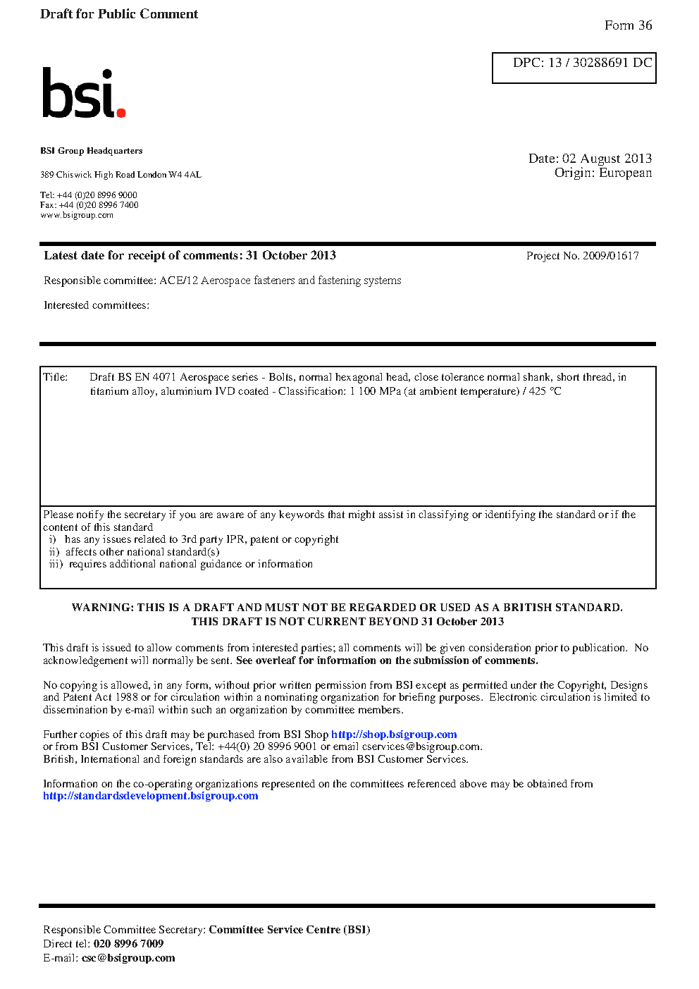 BS EN 4071. Aerospace series. Bolts, normal hexagonal head, close tolerance normal shank, short thread, in titanium alloy, aluminium IVD coated. Classification: 1 100 MPa (at ambient temperature) / 425 °C