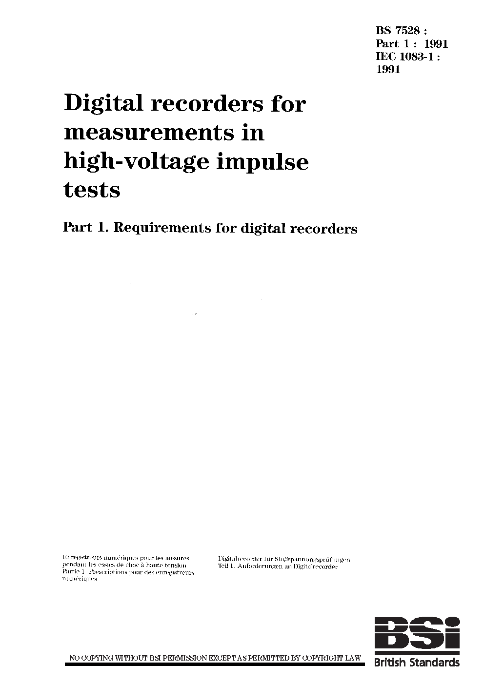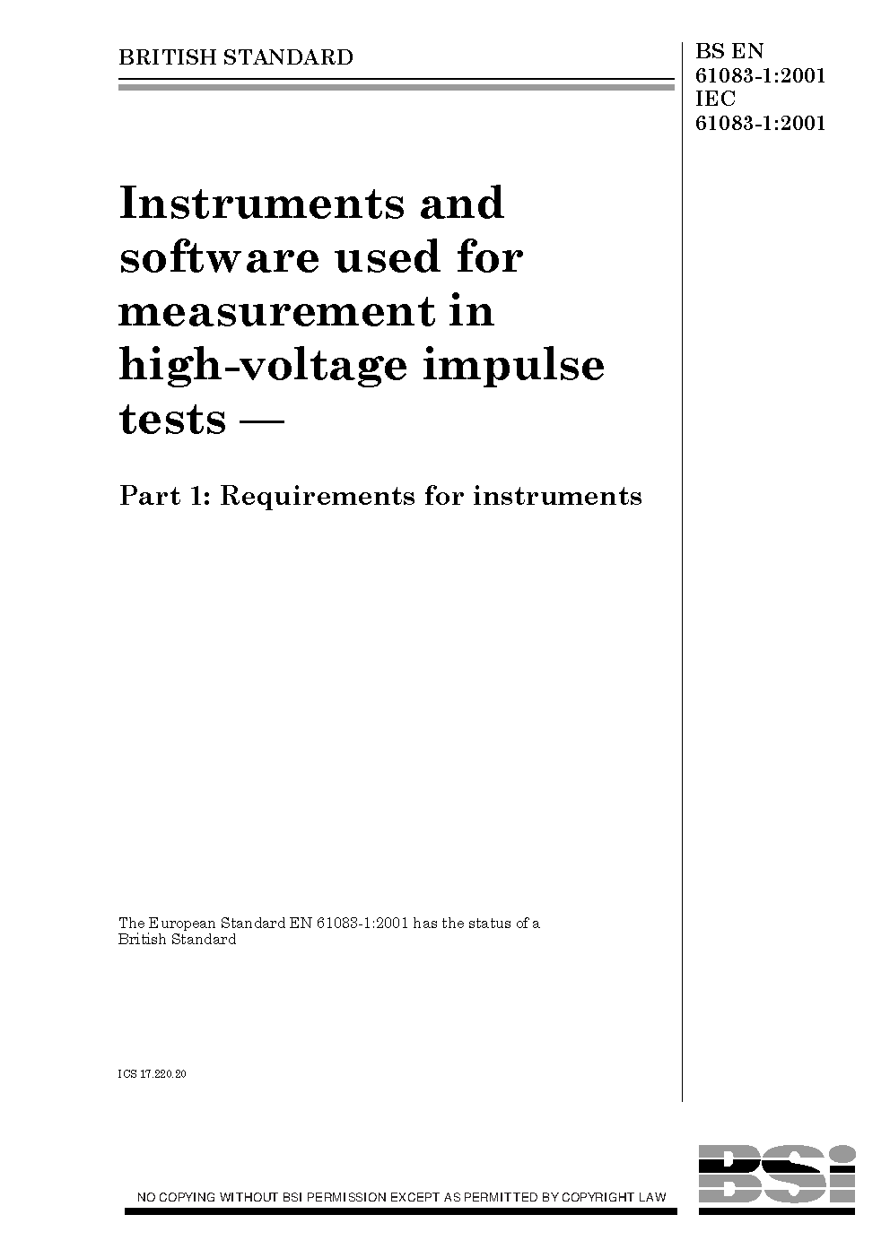 BS EN 61083-1. Instruments and software used for measurements in high-voltage and high-current tests. Part 1. Requirements for hardware for impulse tests. 'Proposed Horizontal Standard'