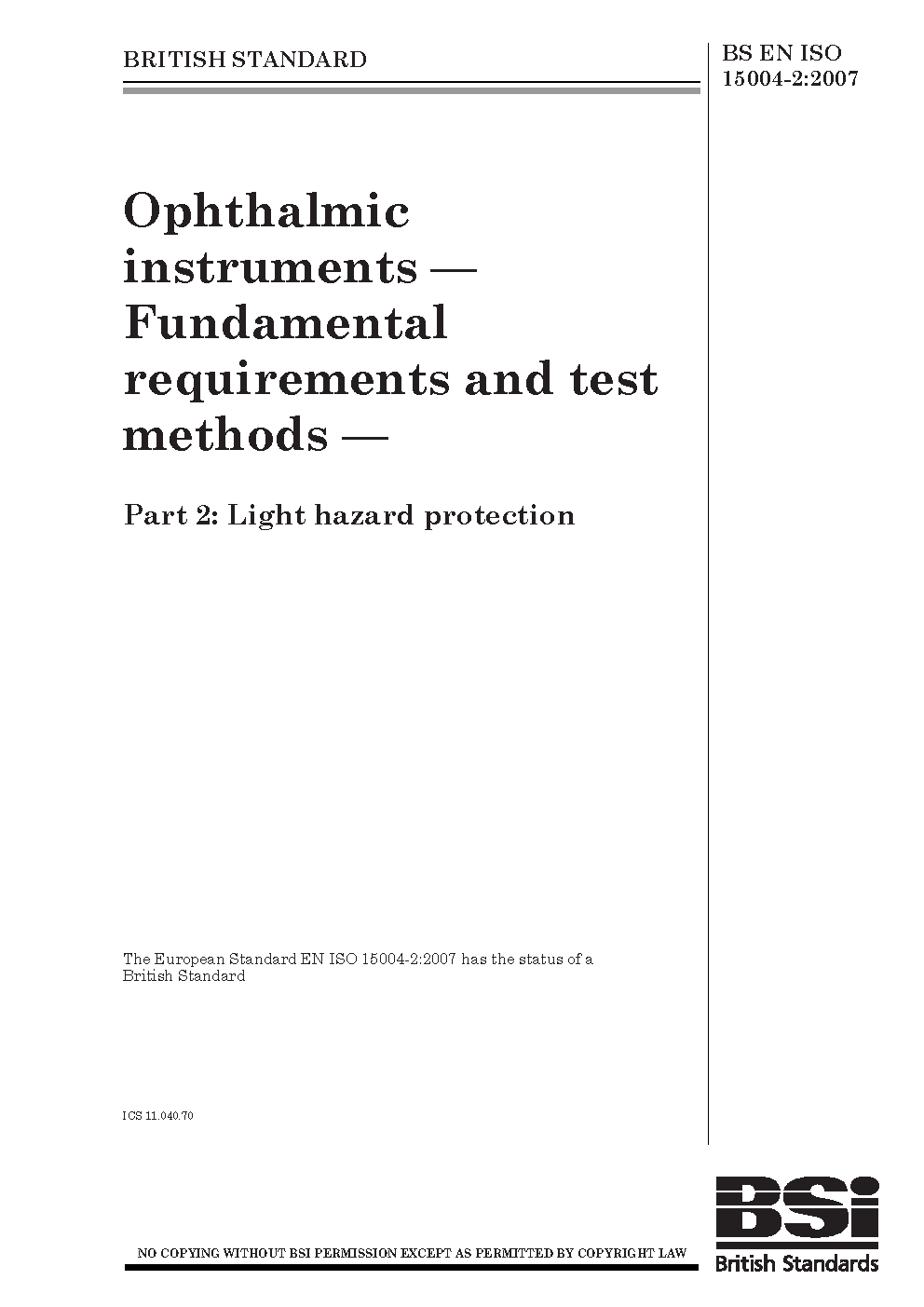 BS EN ISO 15004-2. Ophthalmic instruments. Fundamental requirements and test methods. Part 2. Light hazard protection