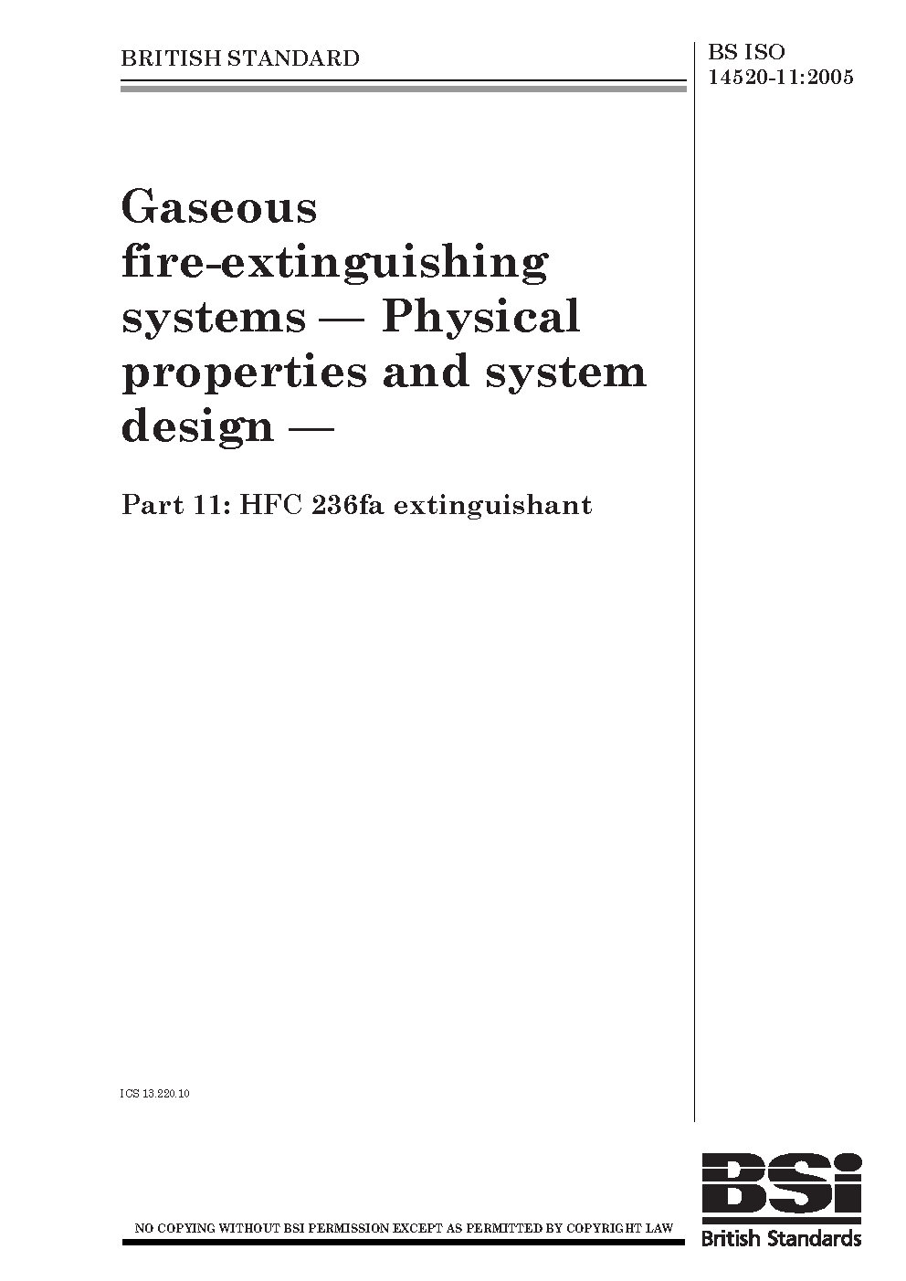 BS ISO 14520-11. Gaseous media fire-extinguishing systems. Physical properties and system design. Part 11. HFC 236fa extinguishant