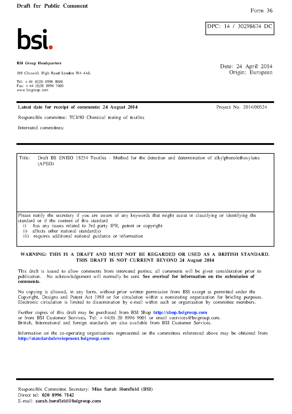 BS EN ISO 18254. Textiles. Method for the detection and determination of alkylphenolethoxylates (APEO)