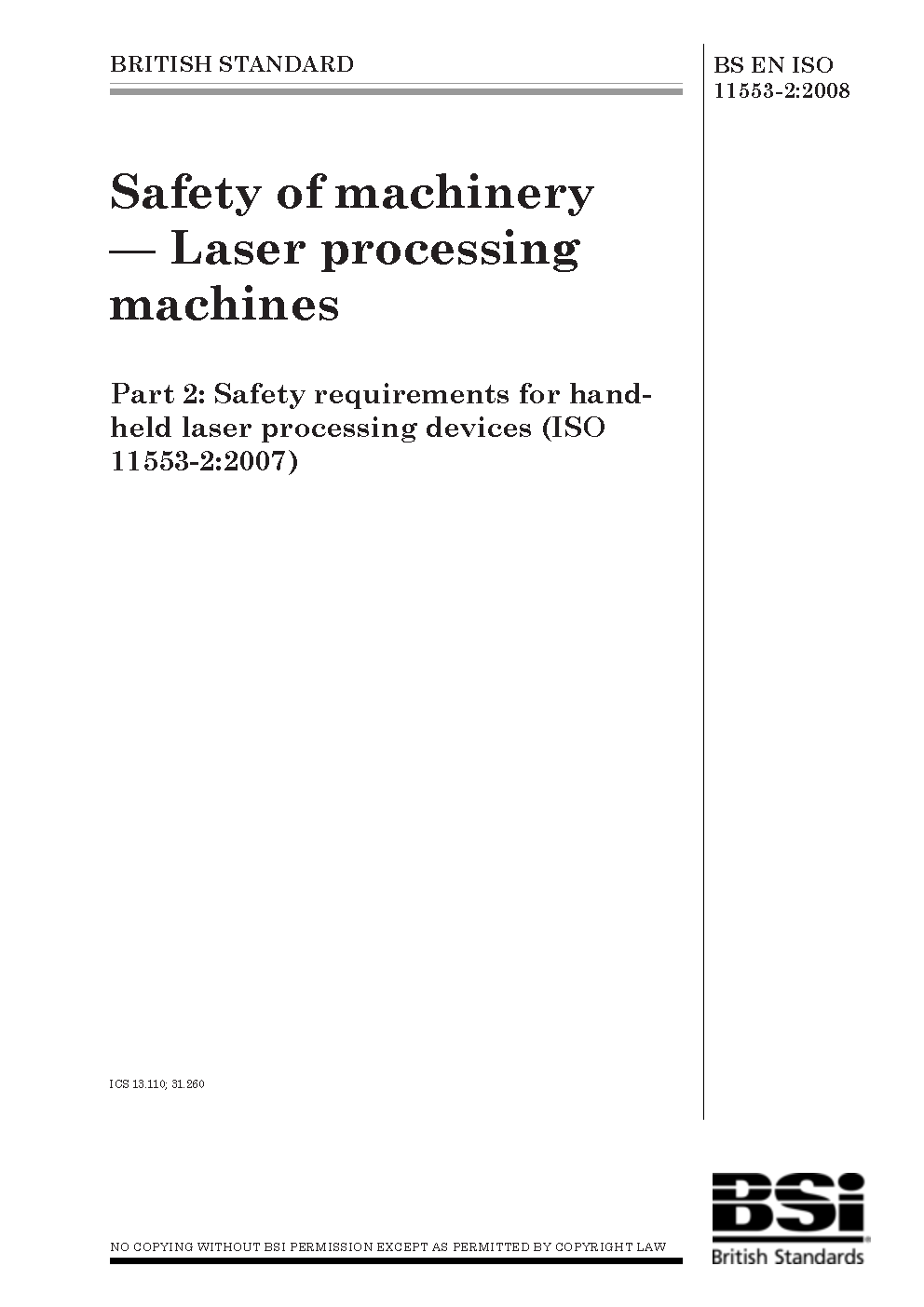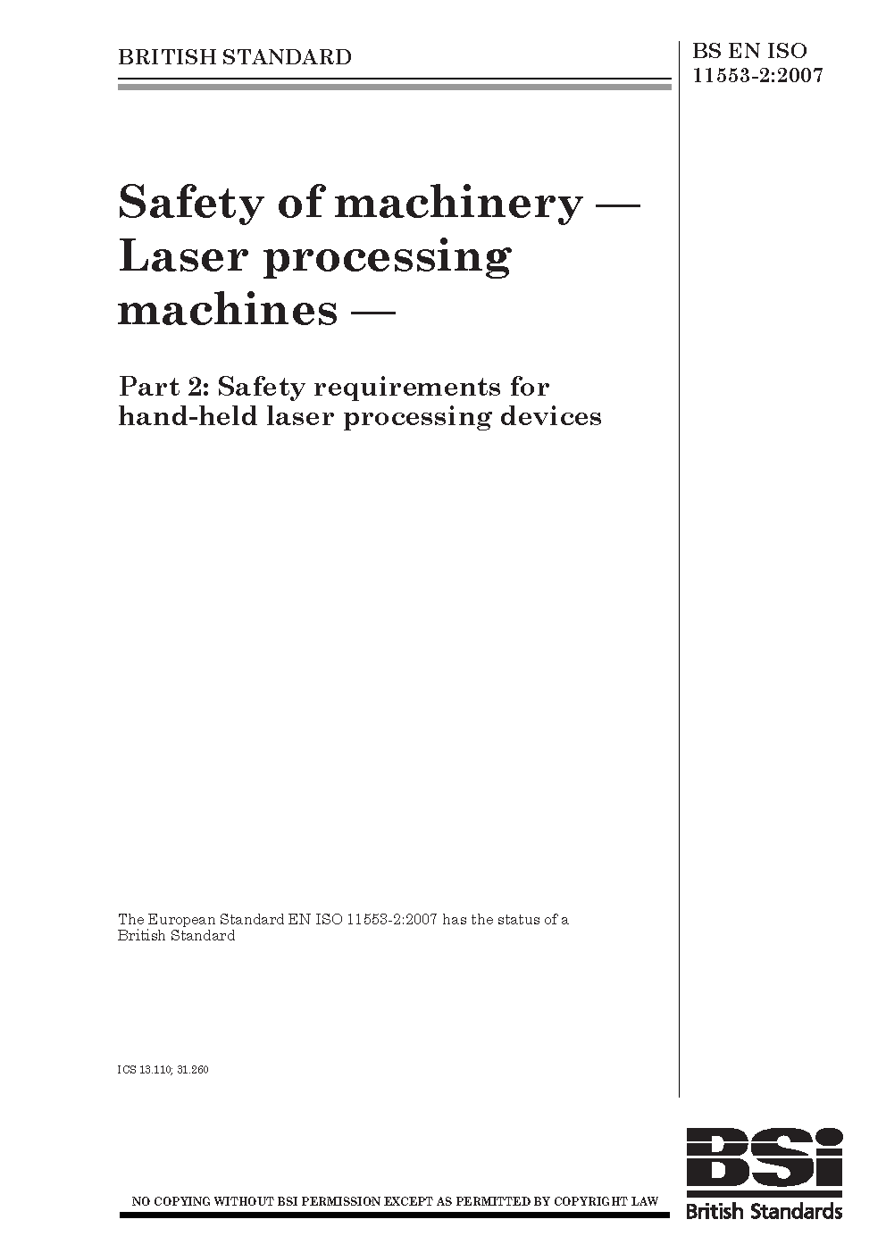 BS EN ISO 11553-2. Safety of machinery. Laser processing machines. Part 2. Safety requirements for hand-held laser processing devices