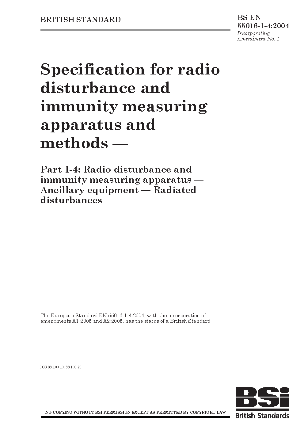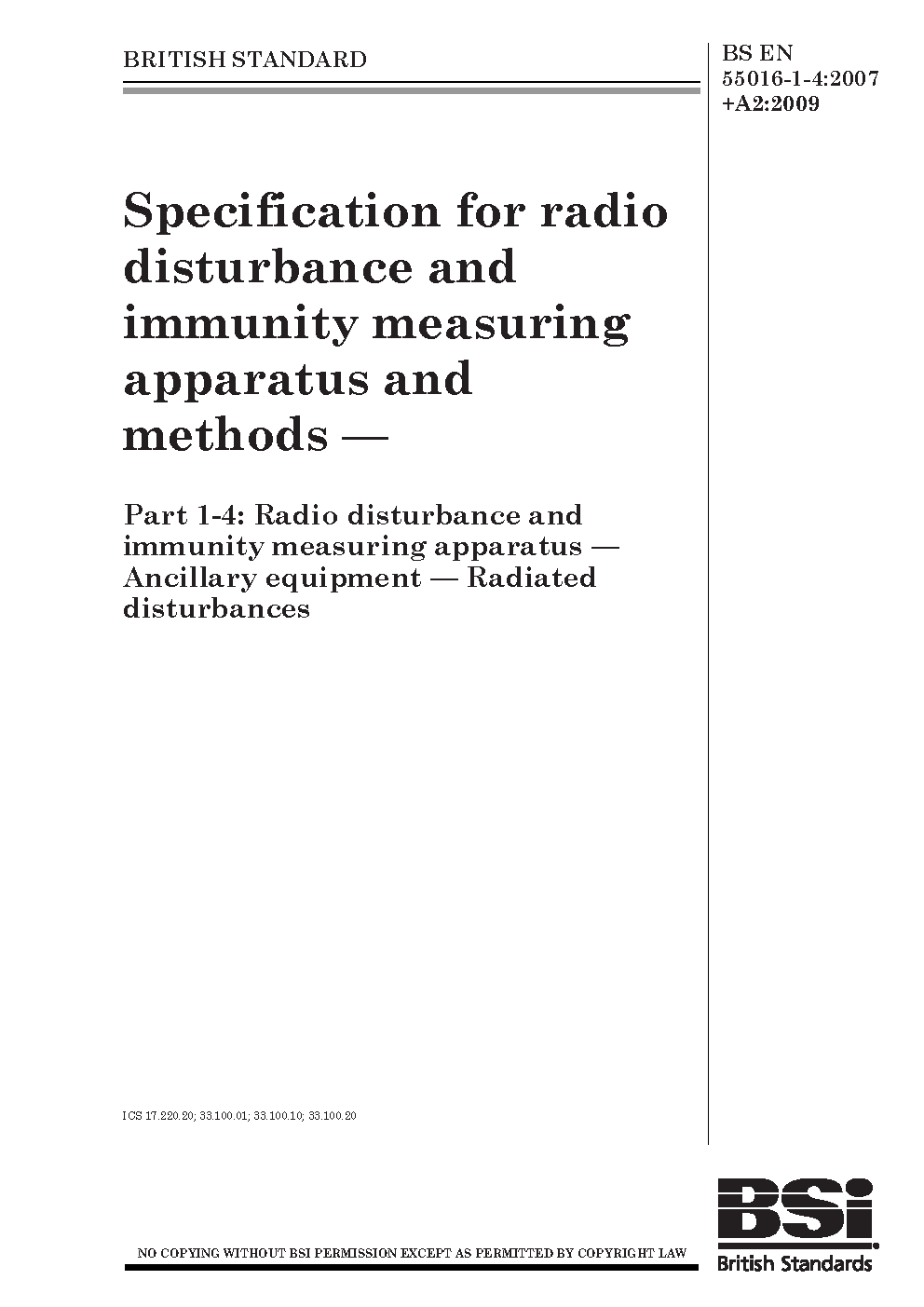 BS EN 55016-1-4 AMD2. Specification for radio disturbance and immunity measuring apparatus and methods. Part 1-4. Radio disturbance and immunity measuring apparatus. Antennas and test sites for radiated disturbance measurements