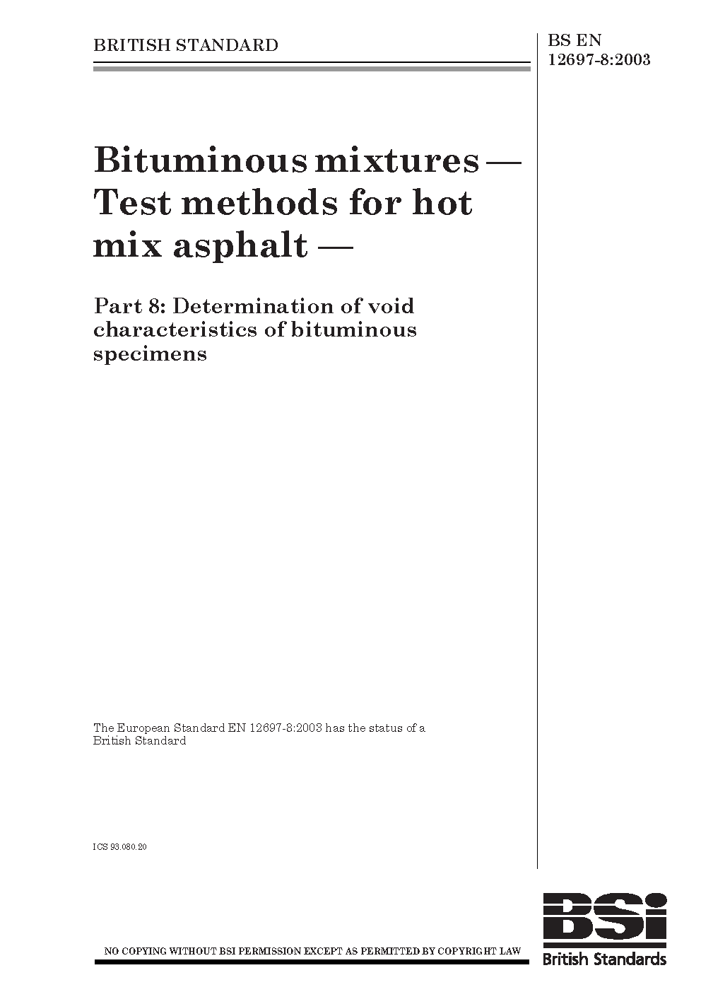 BS EN 12697-8. Bituminous mixtures. Test methods. Part 8. Determination of void characteristics of bituminous specimens