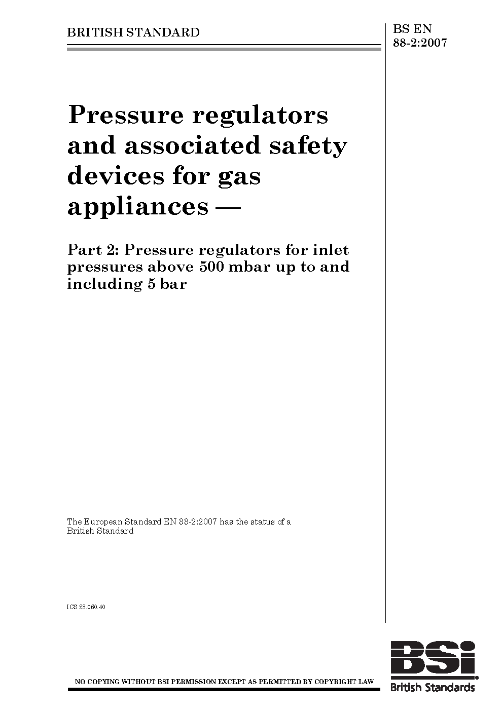 BS EN 88-2. Safety and control devices for gas burners and gas burning appliances. Part 2. Pressure regulators for inlet pressures above 50 kPa up to and including 500 kPa and associated safety devices