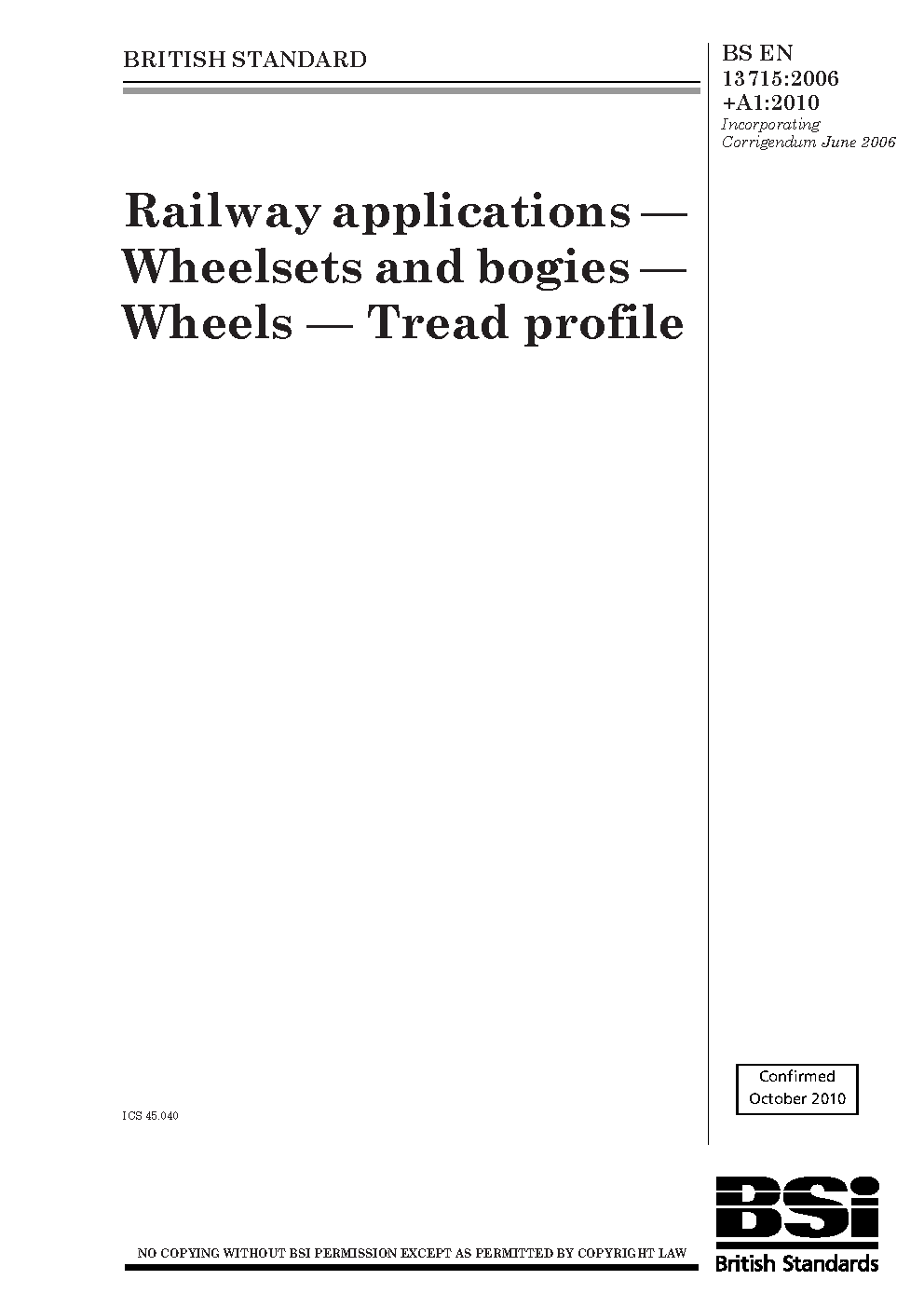 BS EN 13715. Railway applications. Wheelsets and bogies. Wheels. Tread profile