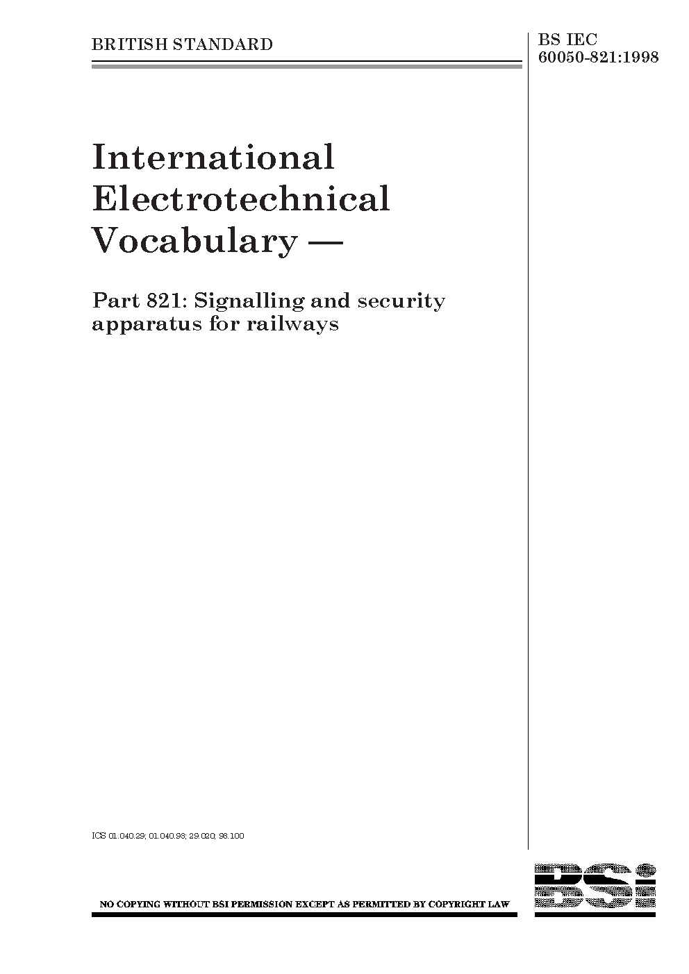 BS IEC 60050-821. International electrotechnical vocabulary. Part 821. Signalling and security apparatus for railways
