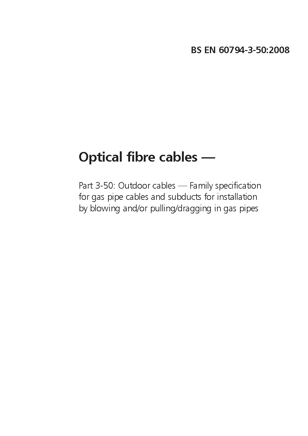 BS EN 60794-3-50. Optical fibre cables. Part 3-50. Outdoor cables. Family specification for gas pipe cables and subducts for installation by blowing and/or pulling/dragging in/into gas pipes