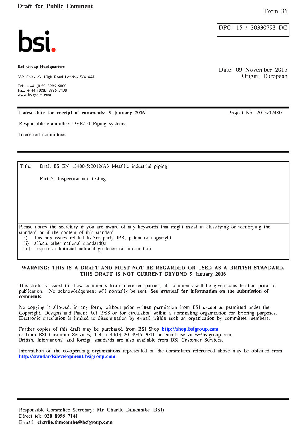BS EN 13480-5 AMD3. Metallic industrial piping. Part 5. Inspection and testing