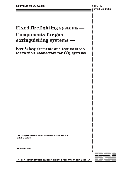 Fire extinguishers;Leak tests;Approval testing;Components;Fire extinguishers (built-in);Flexible pipes;Instructions for use;Iodine;Pressure;Thermal resistance;Hose connectors;Fixed;Group 0 elements;Pipe fittings;Performance;Bend testing;Pressure testing;Conformity;Gases;Marking;Thermal testing;Design;Halogenated hydrocarbons;Chlorine;Bromine;Fire safety in buildings;Type testing;Firefighting equipment;Burst tests;Carbon dioxide;Quality control;Fluorine