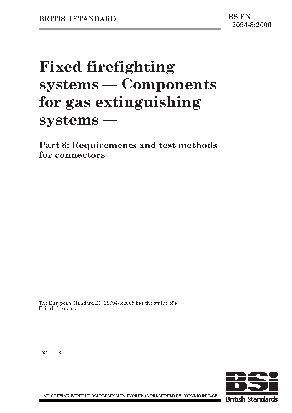 BS EN 12094-8. Fixed firefighting systems. Components for gas extinguishing systems. Part 8. Requirements and test methods for connectors