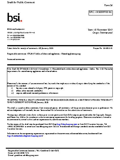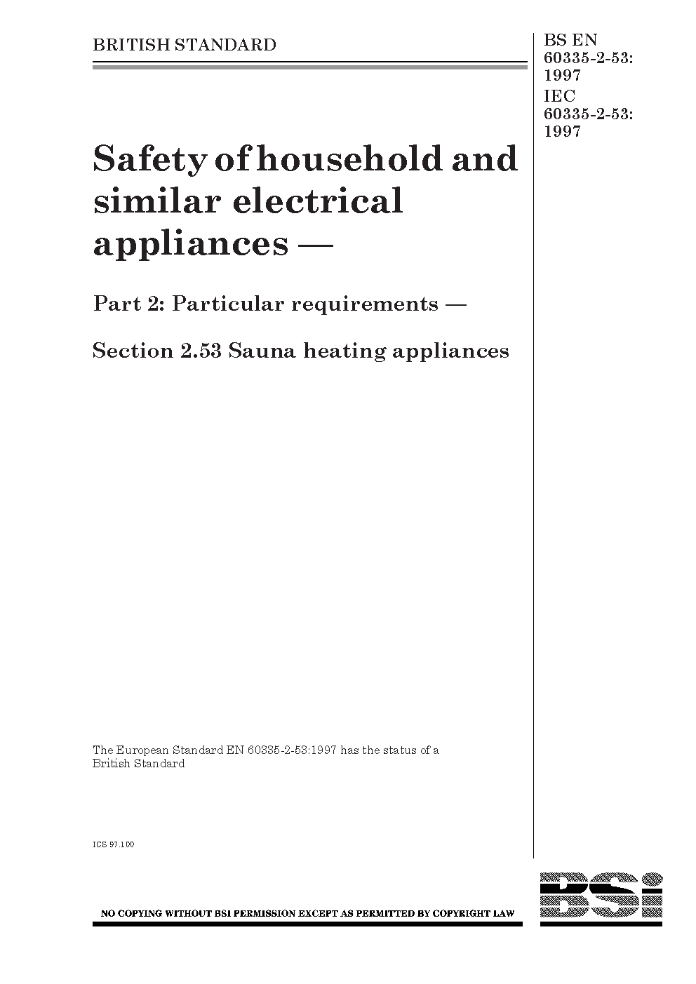 BS EN 60335-2-53 AMD AA. Household and similar electrical appliances. Safety. Part 2-53. Particular requirements for sauna heating appliances and infrared cabins