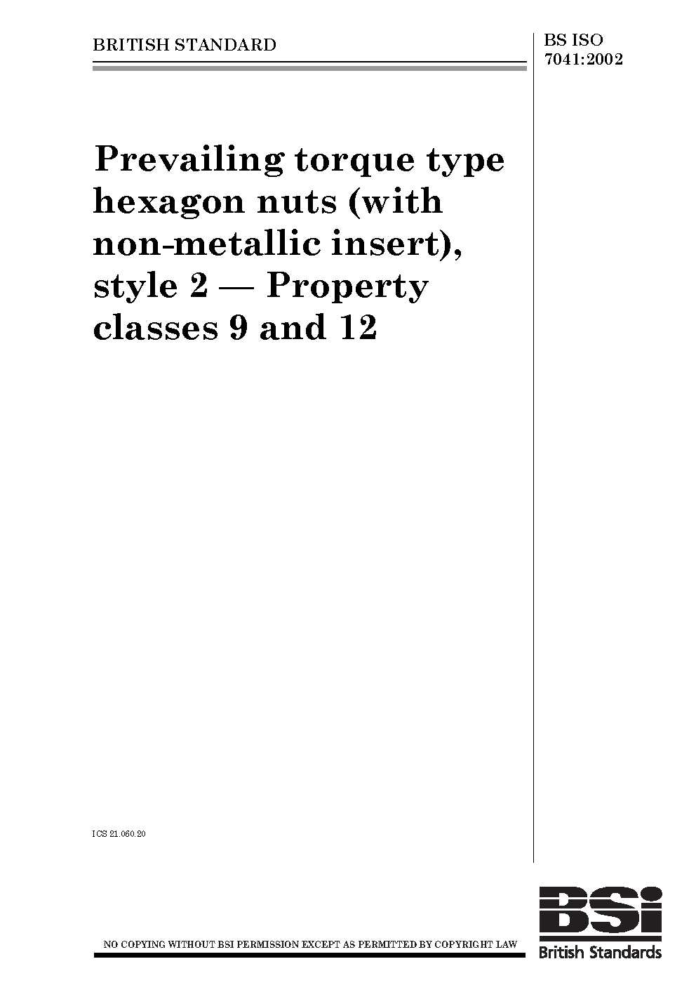 BS ISO 7041. Prevailing torque hexagon high nuts (with non-metallic insert). Product grades A and B
