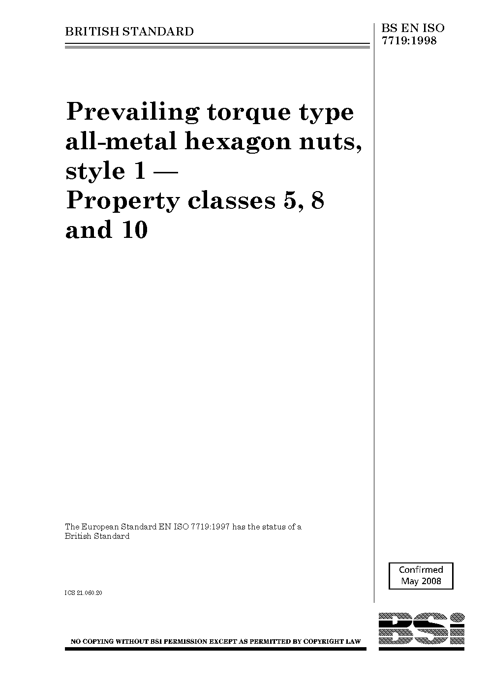 BS EN ISO 7719. Prevailing torque (all-metal) hexagon regular nuts. Product grades A and B