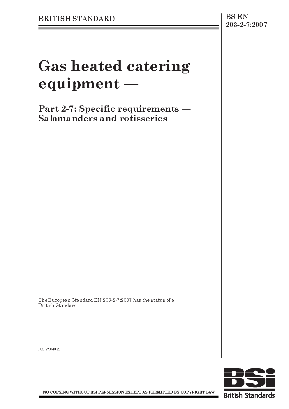 BS EN 203-2-7. Gas heated catering equipment. Part 2-7. Specific requirements. Salamanders and rotisseries