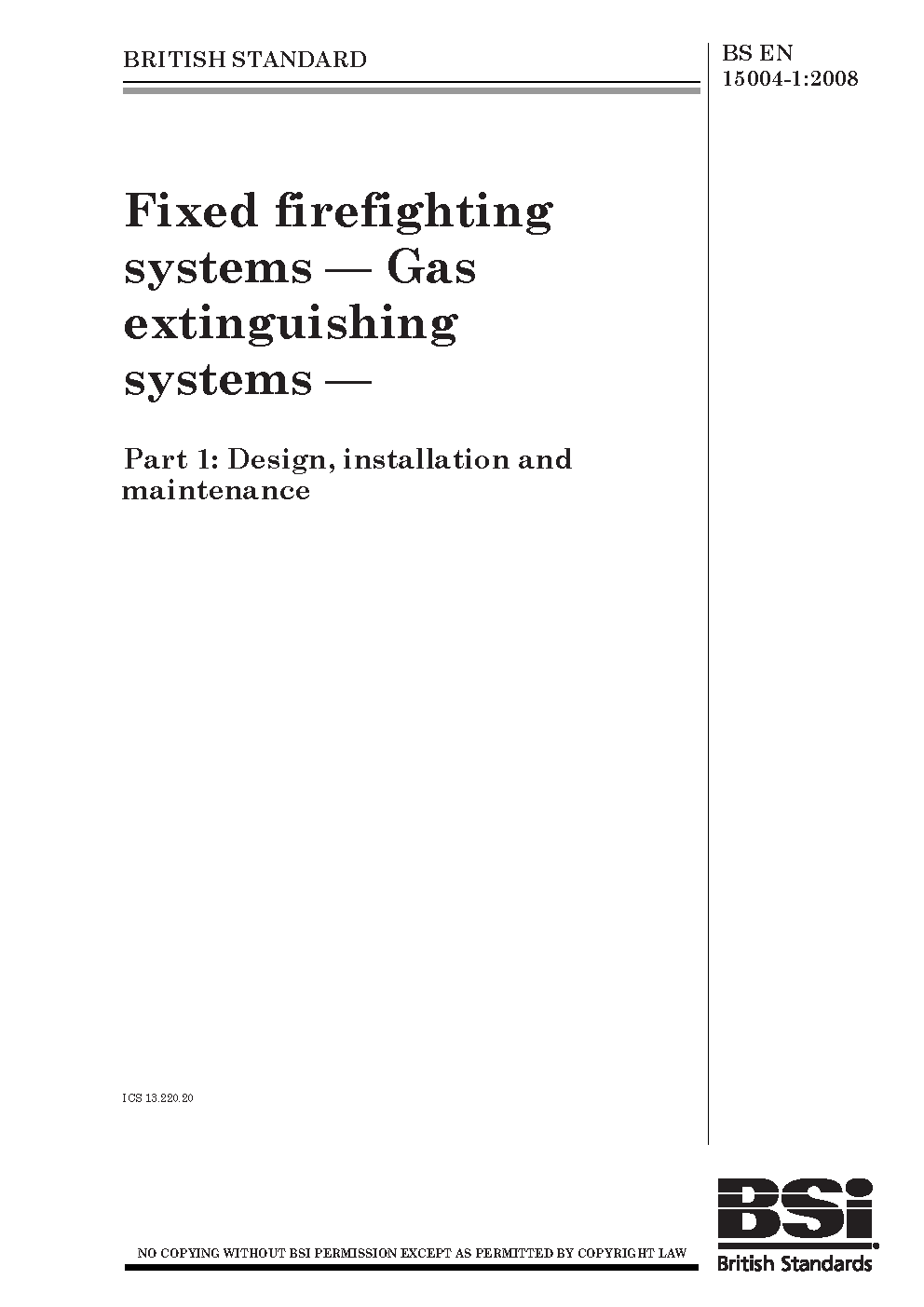 BS EN 15004-1. Fixed firefighting systems. Gas extinguishing systems. Part 1. Design, installation and maintenance