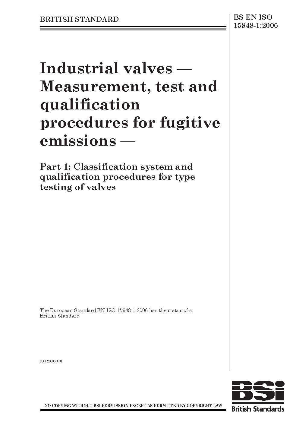BS EN ISO 15848-1 AMD1. Industrial valves. Measurement, test and qualification procedures for fugitive emissions. Part 1. Classification system and qualification procedures for type testing of valves