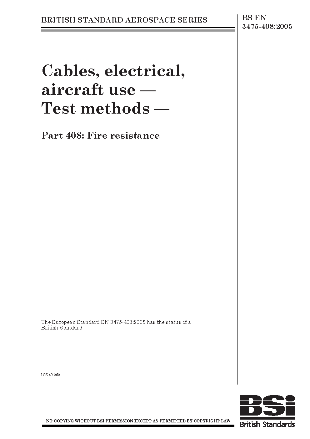 BS EN 3475-408. Aerospace series. Cables electrical aircraft use. Test methods. Part 408. Fire resistance