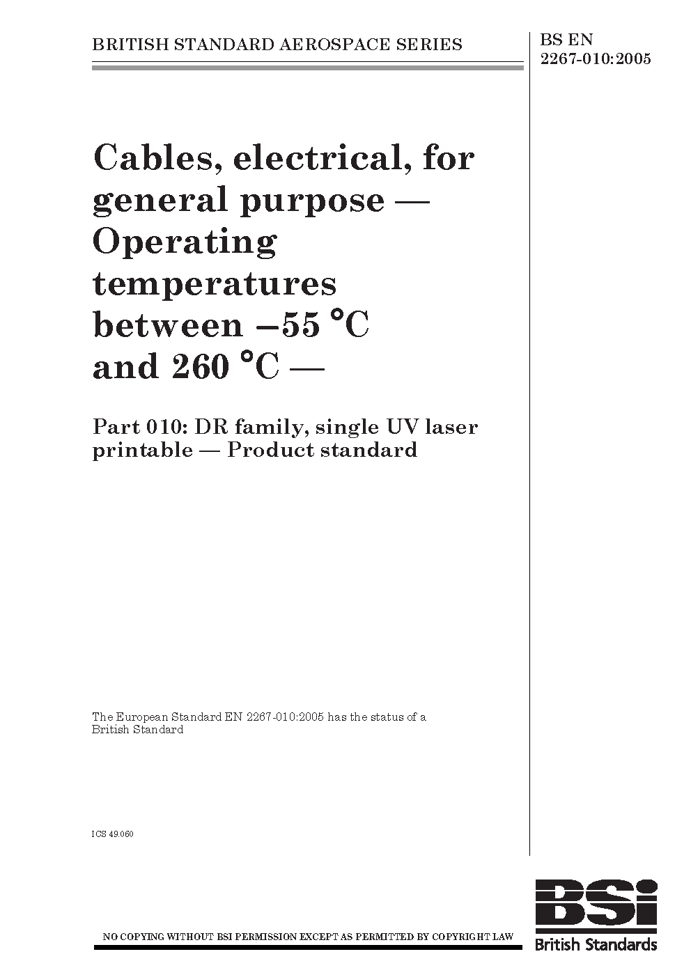 BS EN 2267-010. Aerospace series. Cables, electrical, for general purpose. Operating temperatures between - 55 °C and 260 °C. Part 010. DR family, single UV laser printable. Product standard
