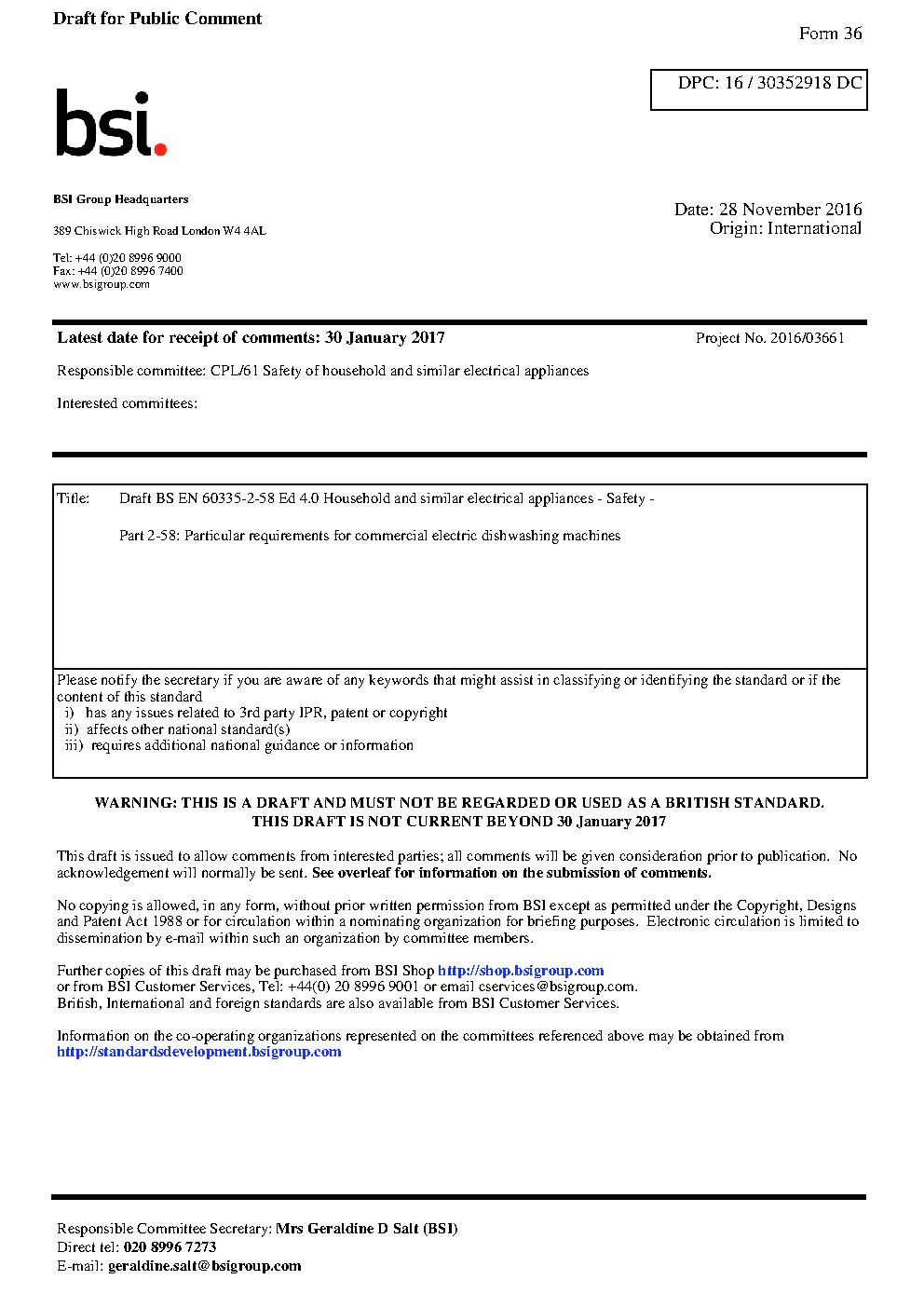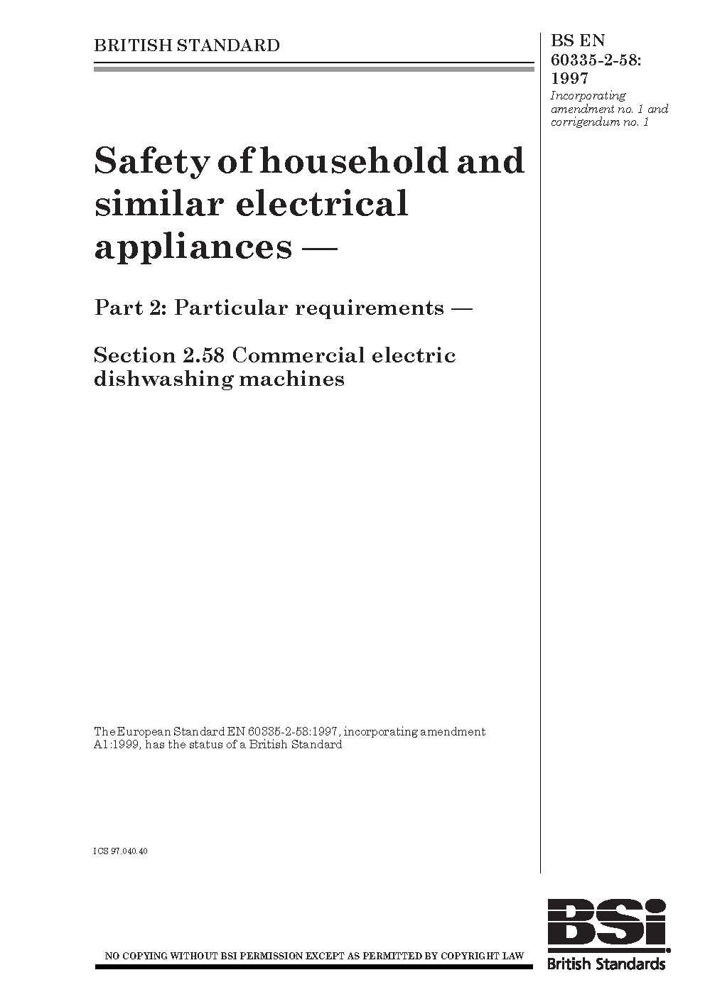 BS EN 60335-2-58. Household and similar electrical appliances. Safety. Part 2-58. Particular requirements for commercial electric dishwashing machines