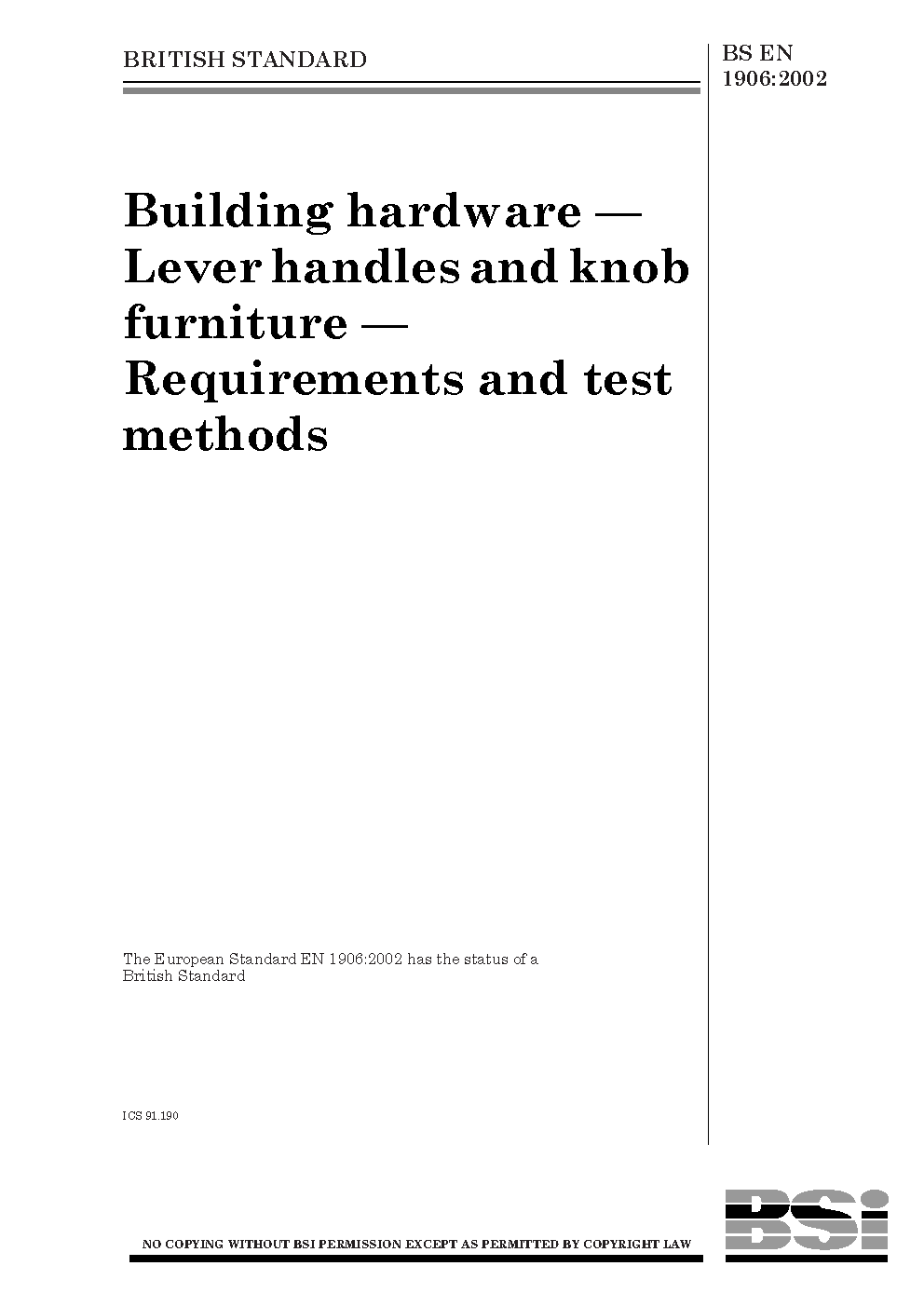 BS EN 1906 AMD1. Building hardware. Lever handles and knob furniture. Requirements and test methods