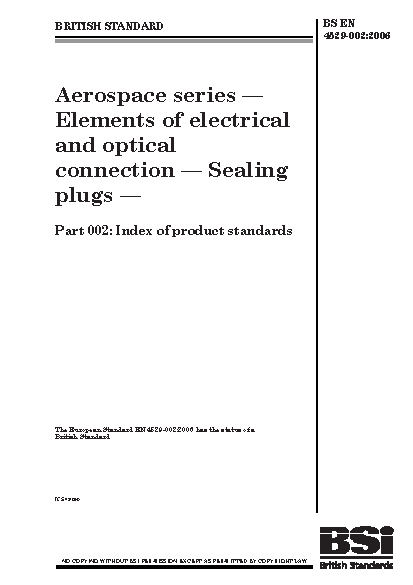 BS EN 4529-002. Aerospace series. Elements of electrical and optical connection. Sealing plugs. Part 002. Index of product standards