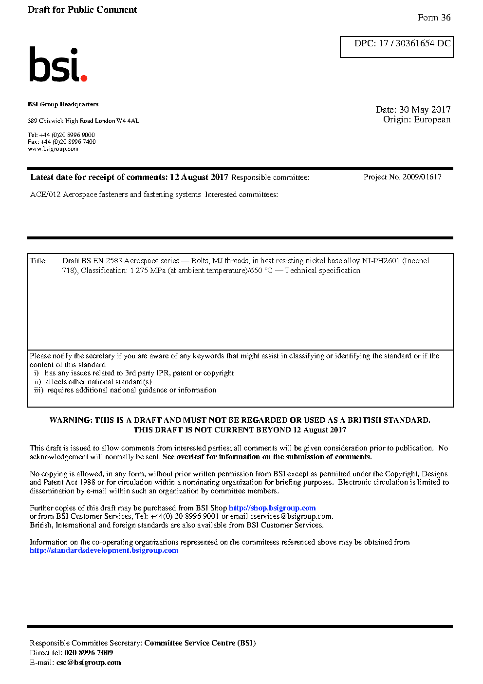 BS EN 2583. Aerospace series. Bolts, MJ threads, in heat resisting nickel base alloy NI-PH2601 (Inconel 718), Classification: 1 275 MPa (at ambient temperature)/650°C. Technical specification