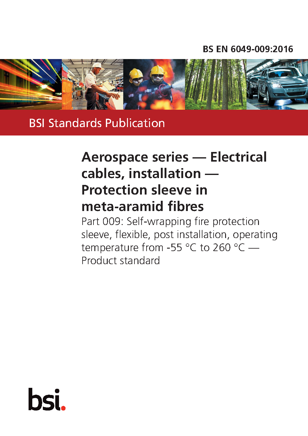 BS EN 6049-009. Aerospace series. Electrical cables, installation. Protection sleeve in meta-aramid fibres Part 009. Self-wrapping fire protection sleeve, flexible, post installation, operating temperature from -55°C to 260°C. Product standard