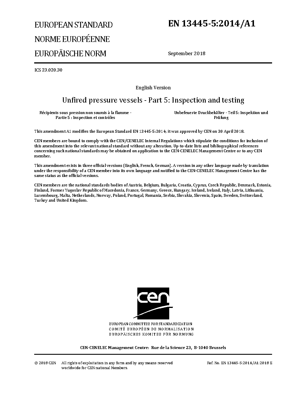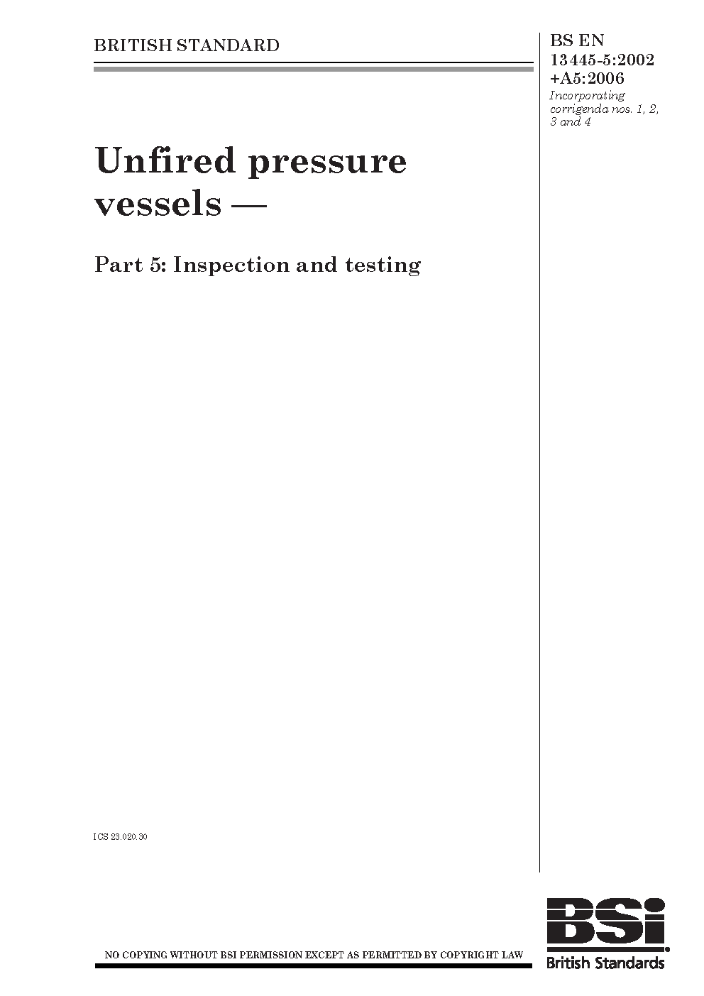 BS EN 13445-5 AMD2. Unfired pressure vessels Part 5. Inspection and testing