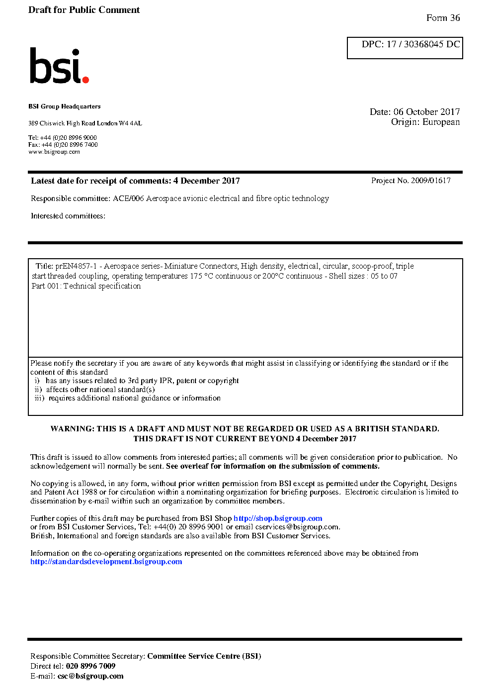 BS EN 4857-1. Aerospace series. Miniature Connectors, High density, electrical, circular, scoop-proof, triple start threaded coupling, operating temperatures 175 °C continuous or 200 continuous. Shell sizes : 05 to 07 Part 001. Technical specification