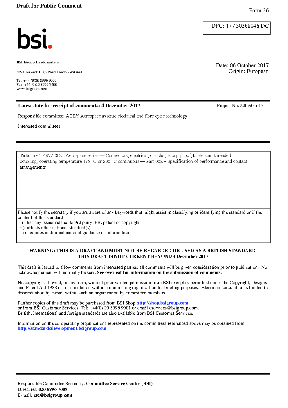 BS EN 4857-002. Aerospace series. Connectors, electrical, circular, scoop-proof, triple start threaded coupling, operating temperature 175 °C or 200 continuous Part 002. Specification of performance and contact arrangements