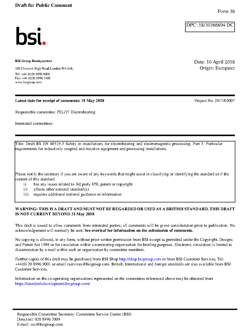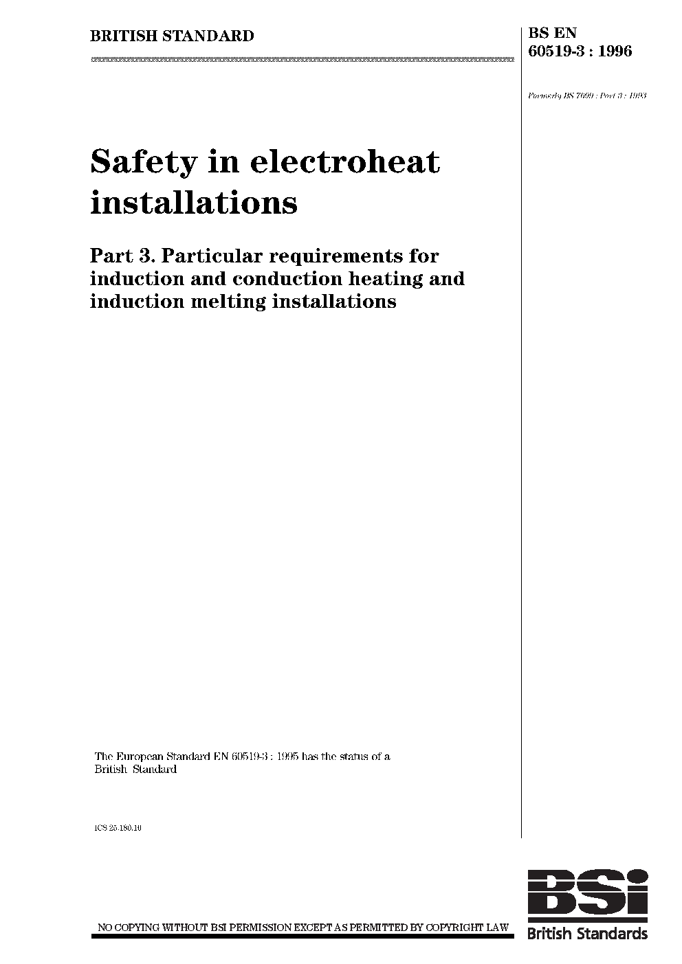 BS EN 60519-3. Safety in installations for electroheating and electromagnetic processing Part 3. Particular requirements inductively coupled resistive equipment