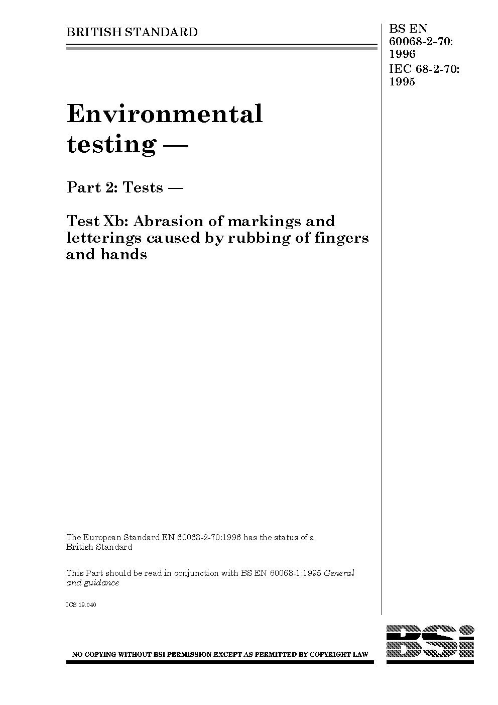 BS EN 60068-2-70. Environmental testing Part 2-70. Tests. Test Xb. Abrasion of markings and letterings caused by rubbing fingers hands