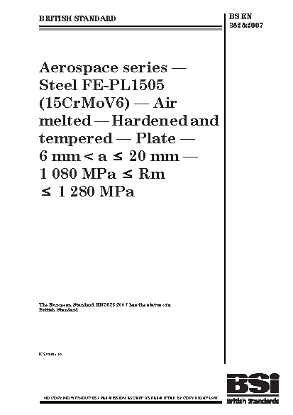 BS EN 3525. Aerospace series. Steel 15CrMoV6 (1.7334). Air melted. Hardened and tempered. Plate. 6 mm < a = 20 mm. 1 080 MPa = Rm = 1 280 MPa