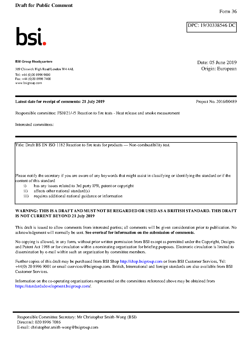 BS EN ISO 1182. Reaction to fire tests for products. Non-combustibility test