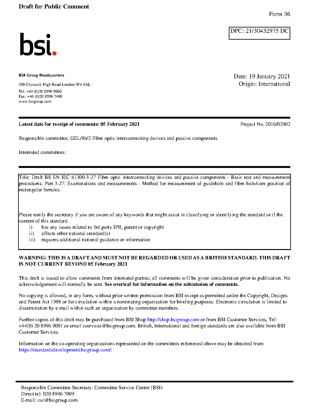 BS EN IEC 61300-3-27. Fibre optic interconnecting devices and passive components. Basic test measurement procedures Part 3-27. Examinations measurements. Method for of guidehole fibre hole/core position rectangular ferrules
