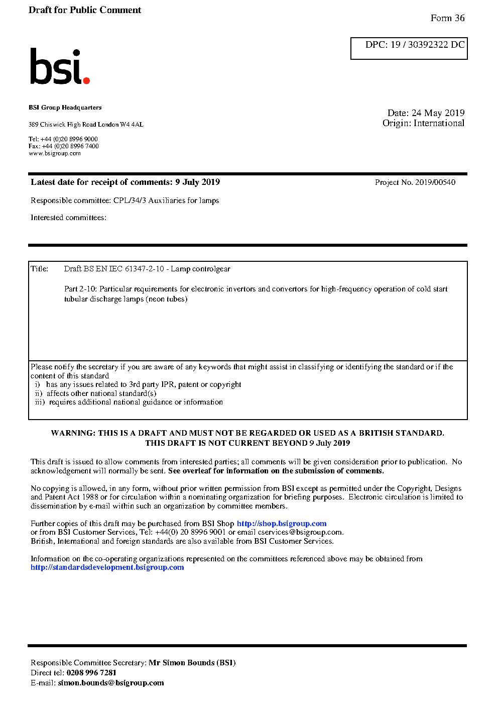 BS EN IEC 61347-2-10. Lamp controlgear Part 2-10. Particular requirements for electronic invertors and convertors high-frequency operation of cold start tubular discharge lamps (neon tubes)