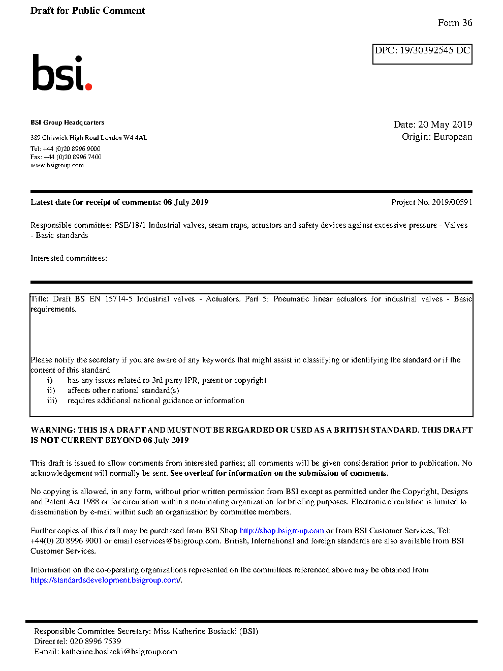 BS EN 15714-5. Industrial valves. Actuators Part 5. Pneumatic linear actuators for industrial Basic requirements