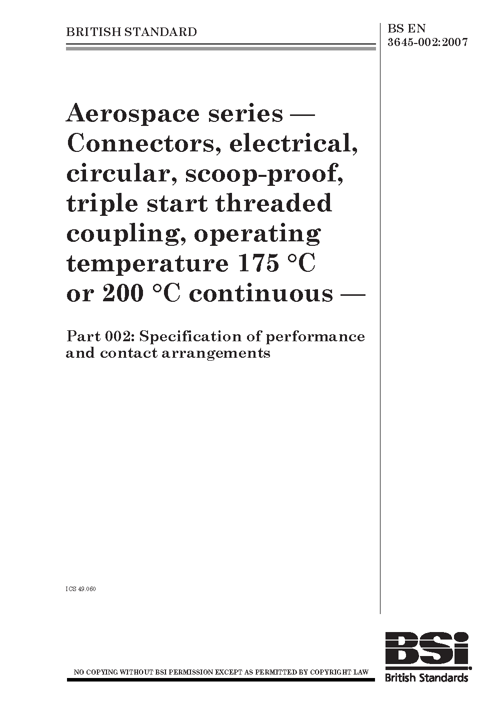 BS EN 3645-002. Aerospace series. Connectors, electrical, circular, scoop-proof, triple start threaded coupling, operating temperature 175 °C or 200 continuous Part 002. Specification of performance and contact arrangements