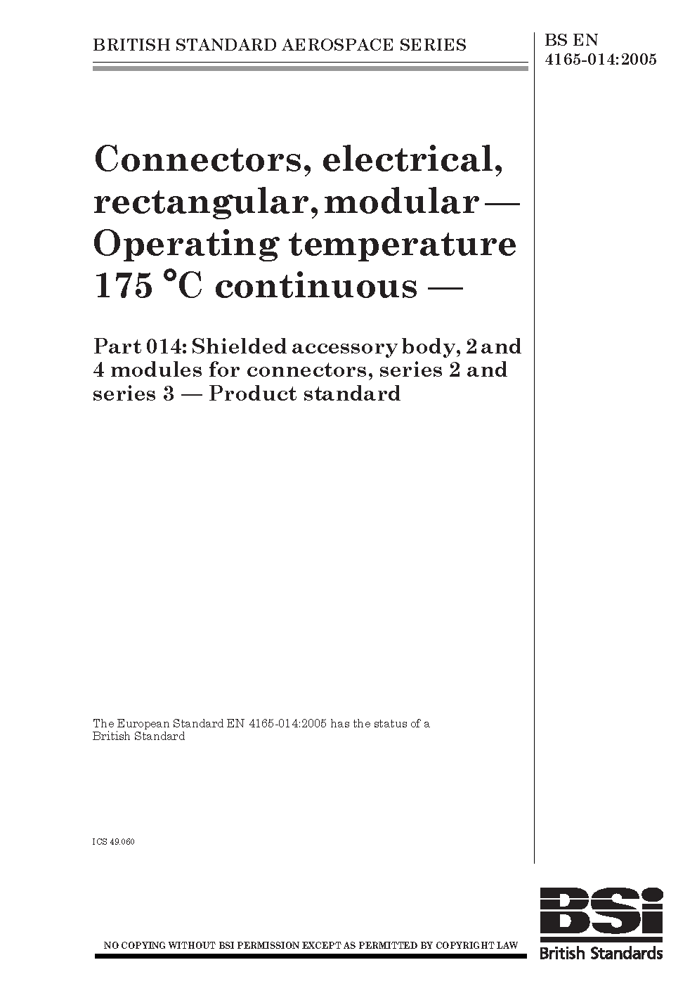 BS EN 4165-014. Aerospace series. Connectors, electrical, rectangular, modular. Operating temperature 175 °C continuous Part 014. Shielded accessory body, 2 and 4 modules for connectors, series 3. Product standard