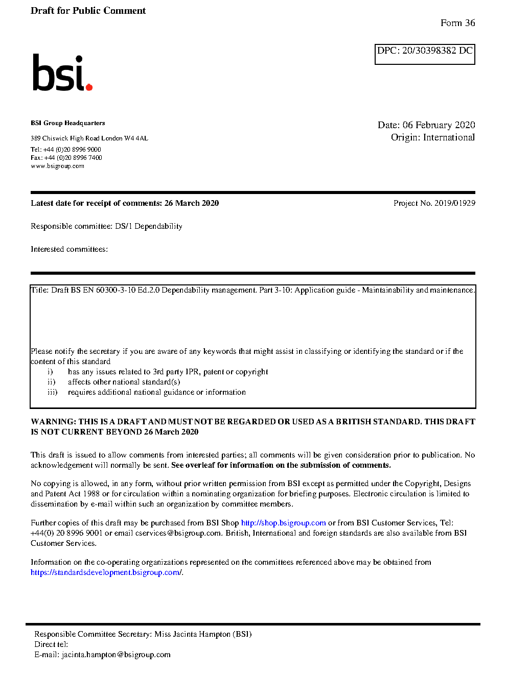 BS EN 60300-3-10. Dependability management Part 3-10. Application guide. Maintainability and maintenance