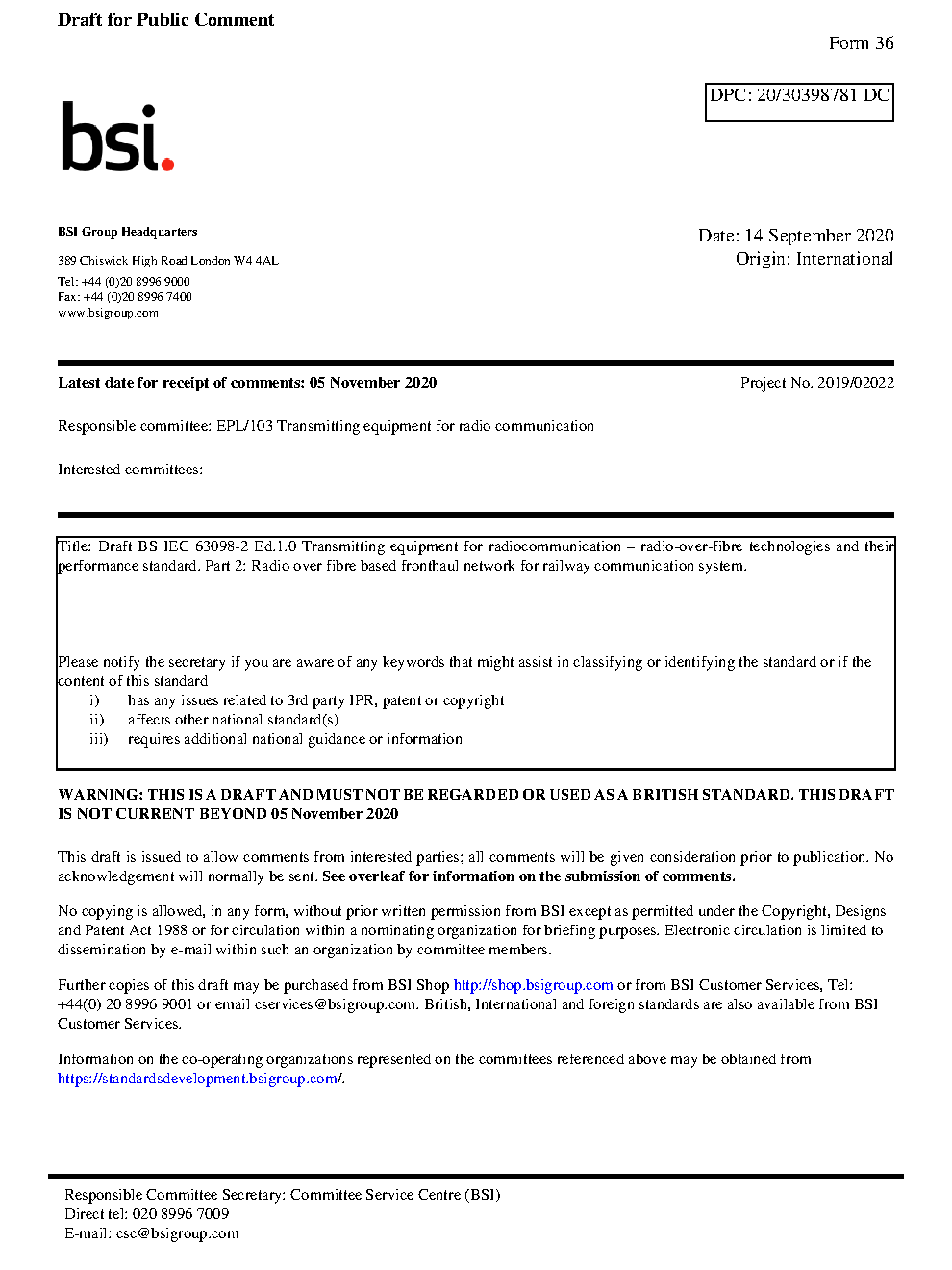 BS IEC 63098-2. Transmitting equipment for radiocommunication. radio-over-fibre technologies and their performance standard Part 2. Radio over fibre based fronthaul network railway communication system