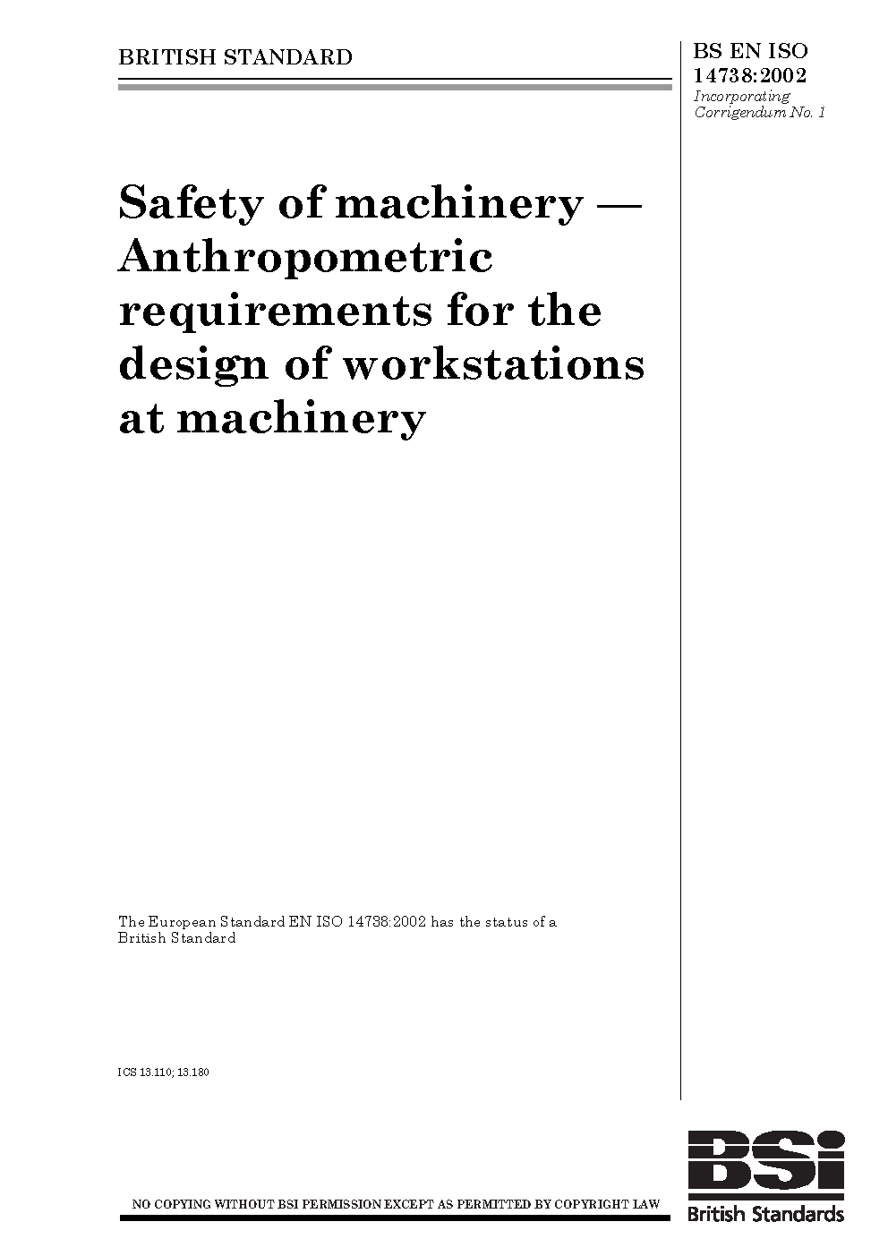 BS EN ISO 14738. Safety of machinery. Anthropometric requirements for the design of workstations for industries and services
